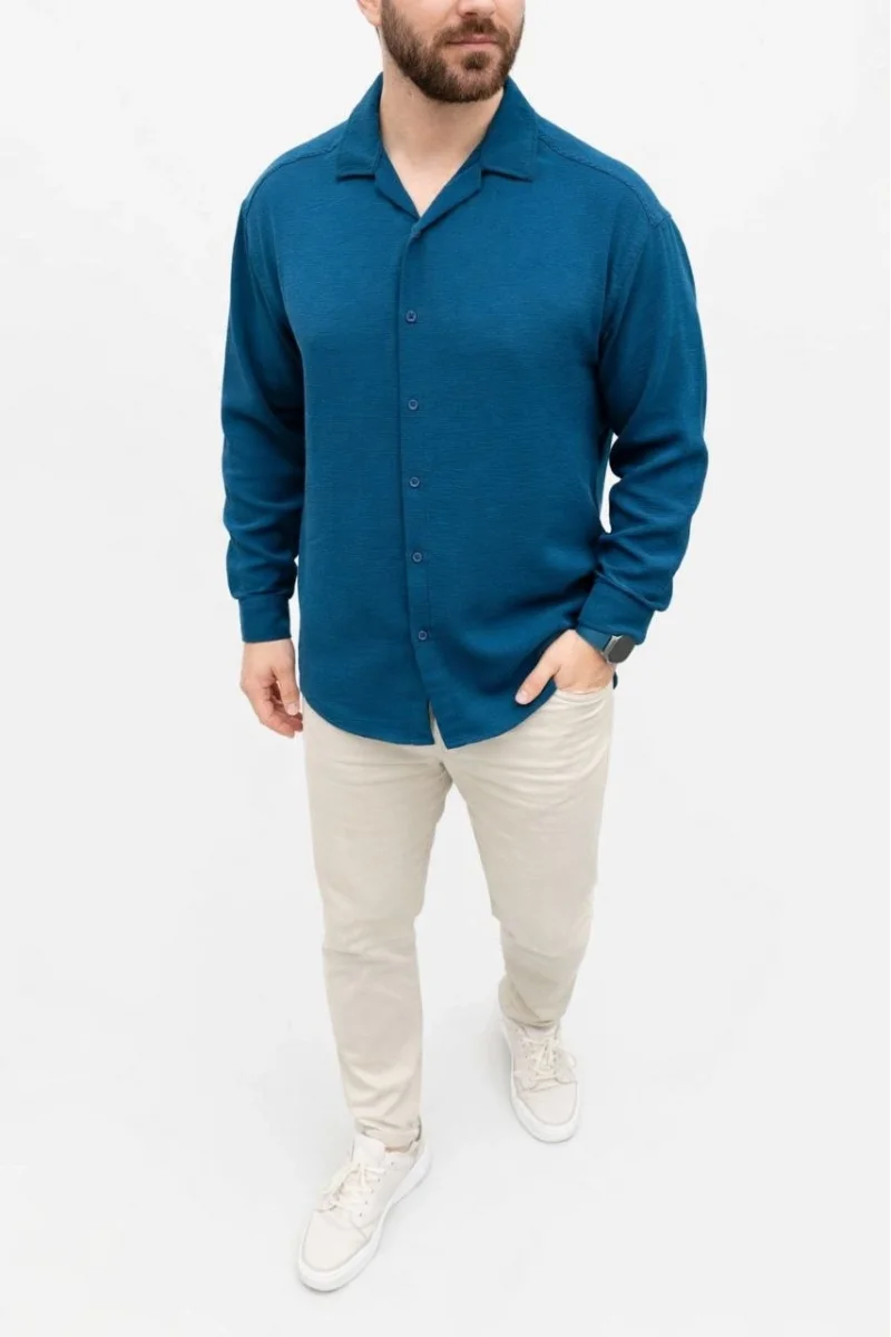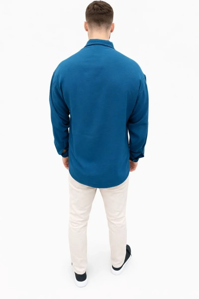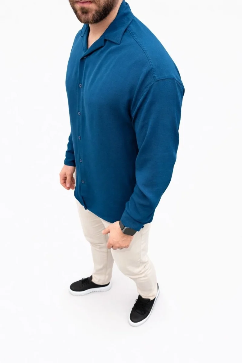 Erkek Aerobin Kumaş Oversize 4 Mevsim Uzun Kollu Rahat Kalıp Gömlek - İndigo