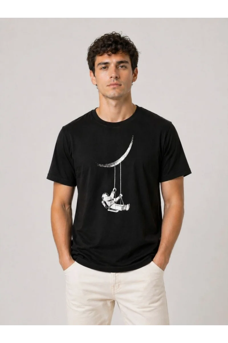 Erkek Astronot Ay Temalı Tişört Kısa Kol Yazlık Bisiklet Yaka T-Shirt - Siyah