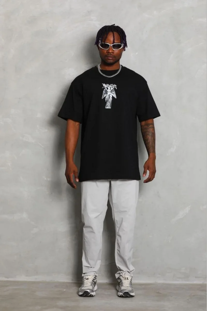 Erkek Baskılı T-Shirt Kısa Kol Bisiklet Yaka Regular Fit Rahat Kalıp Günlük Tişört - Siyah