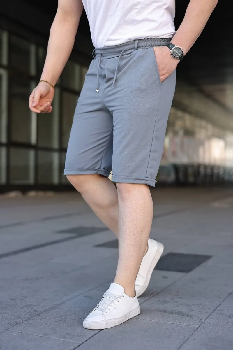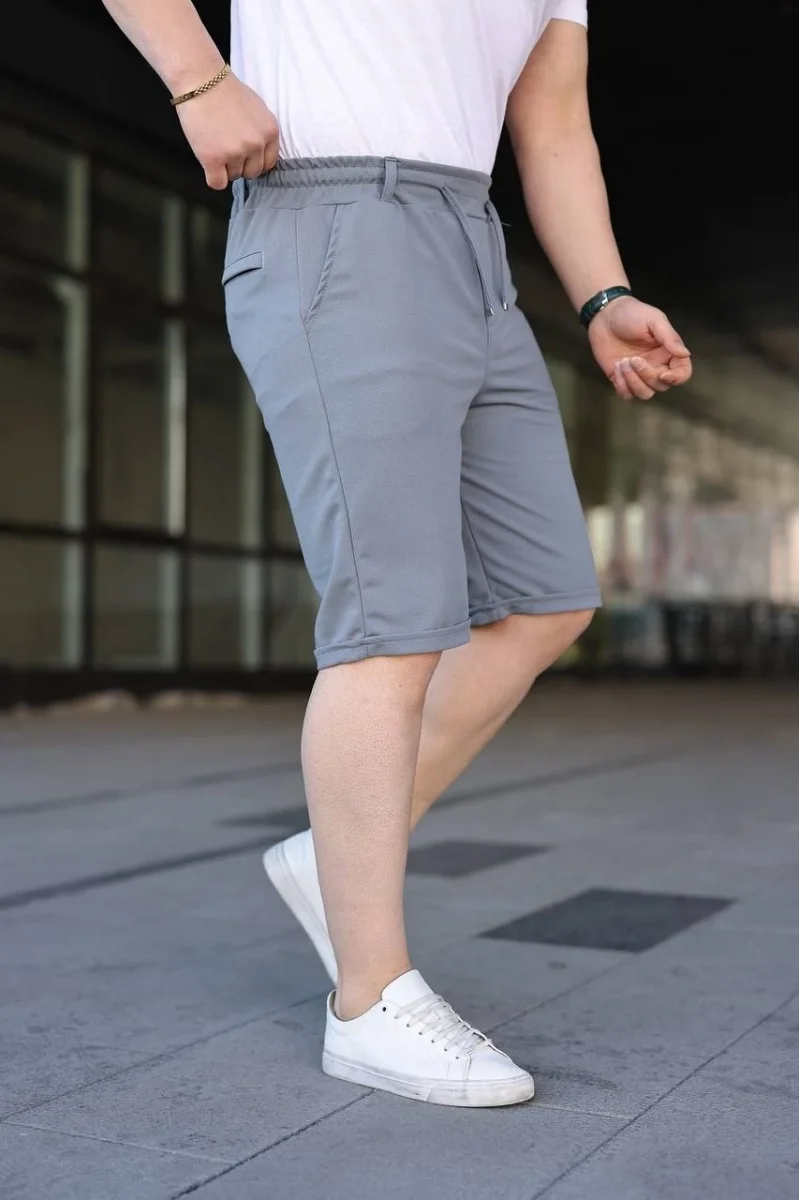 Erkek Diagonel Kumaş Duble Paça Cepli Bağcıklı Bel Lastikli ŞORT - Gri