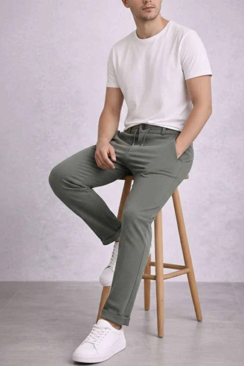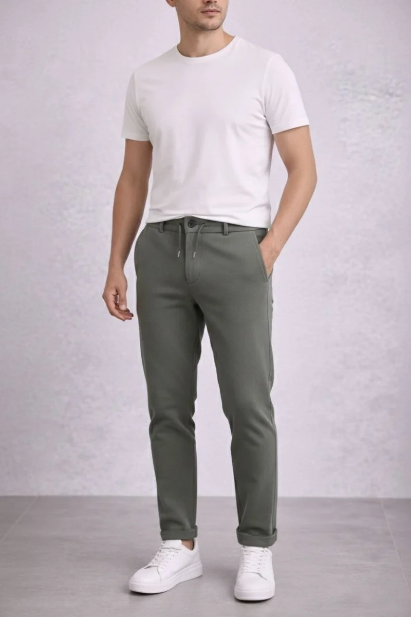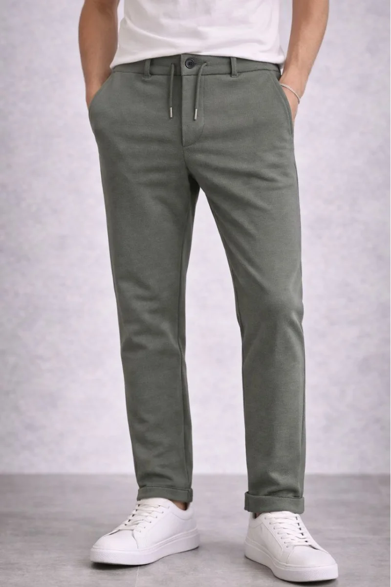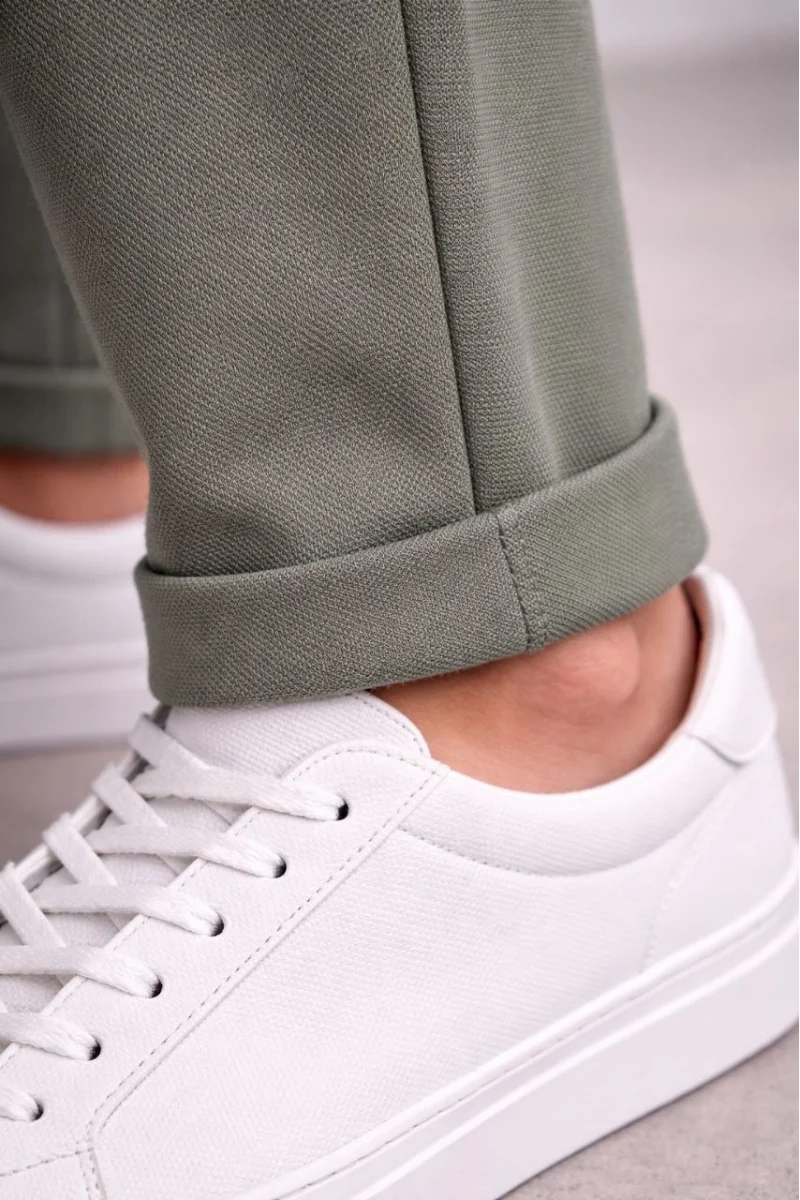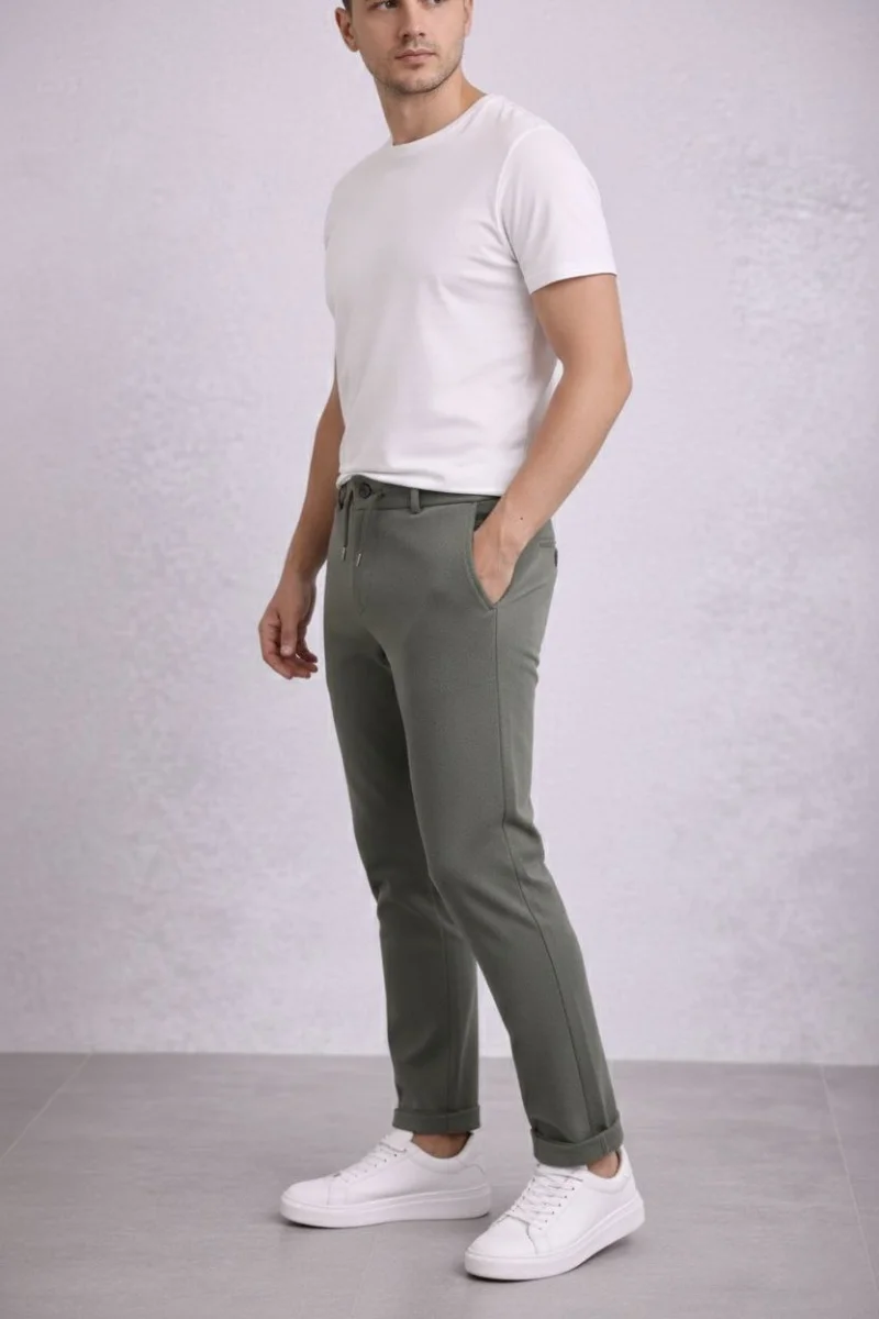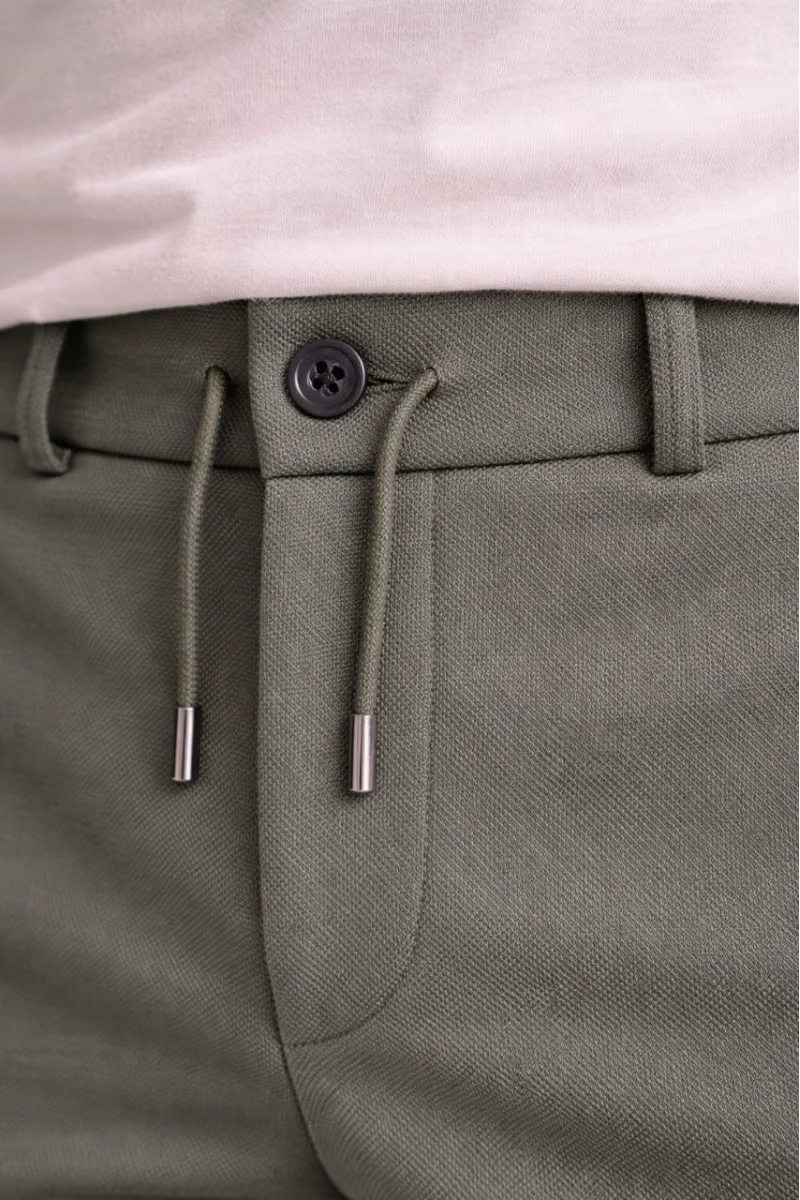 Erkek Diagonel Mikro dokulu Duble Paça Cepli Pantolon Bağcıklı Bel, Modern Kesim - Haki