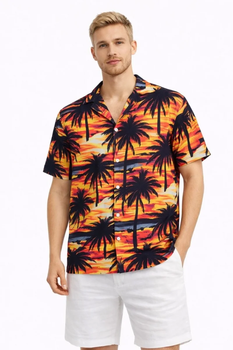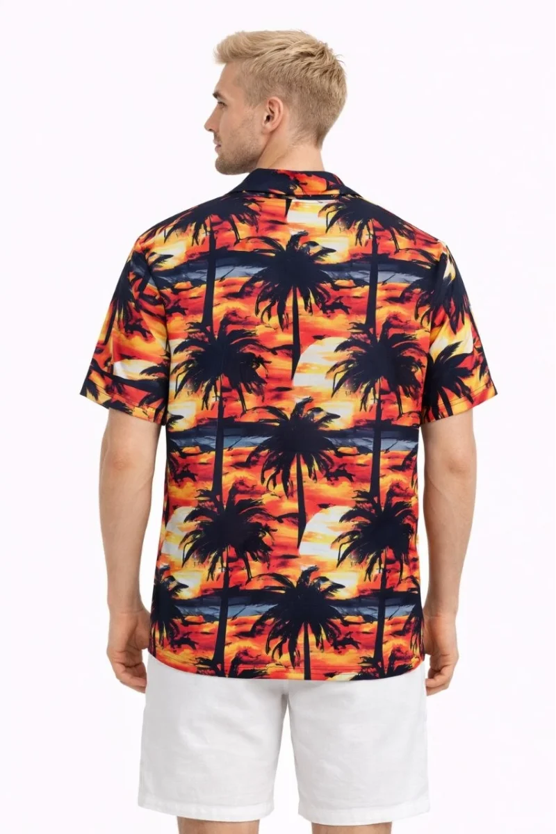 Erkek Gün Batımı Palmiye Desenli Kısa Kol Gömlek Hawaii Tarz Yazlık Rahat Kalıp - Desenli