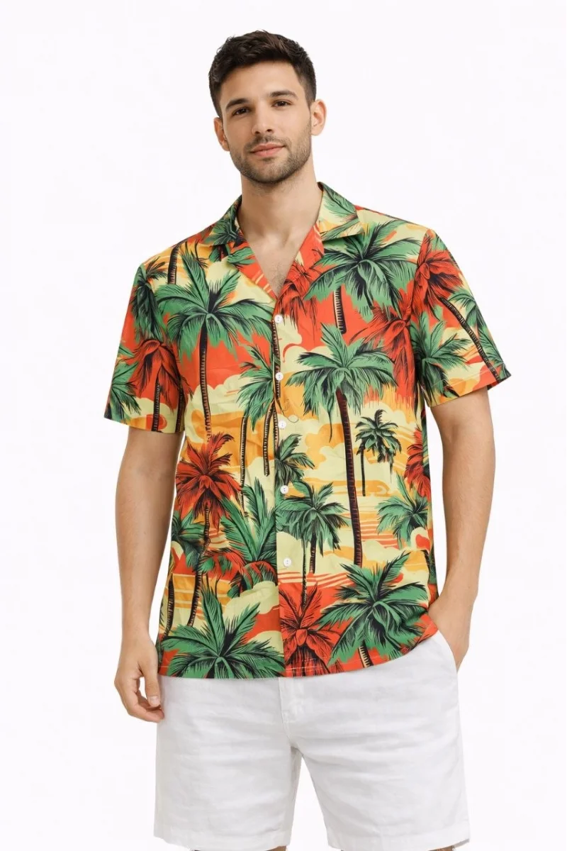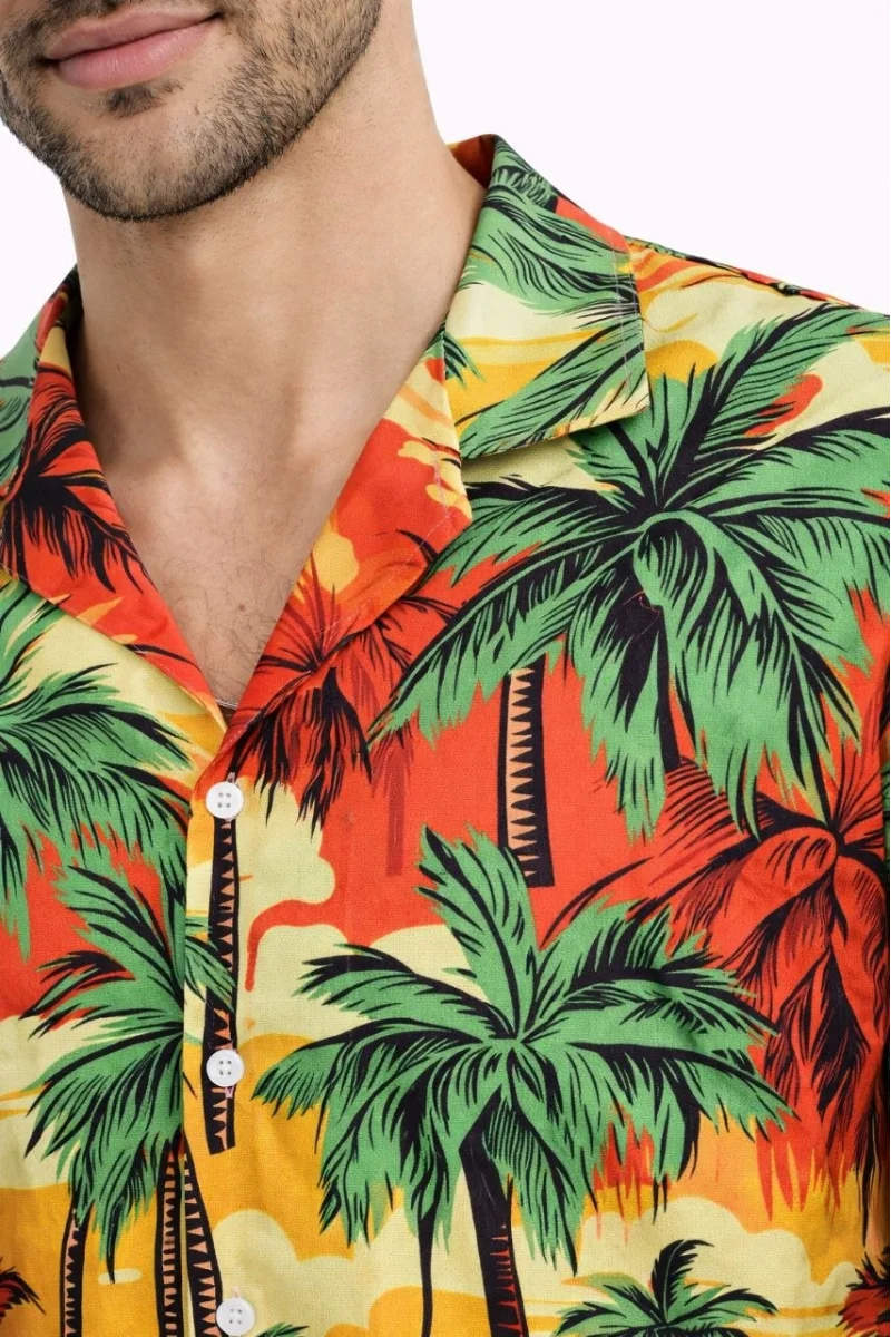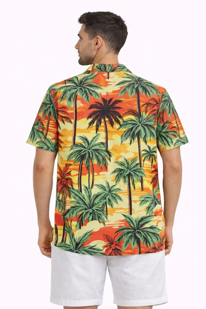 Erkek Hawaii Tarz Tropikal Palmiye Desenli Kısa Kol Gömlek Rahat Kalıp Yazlık - Desenli