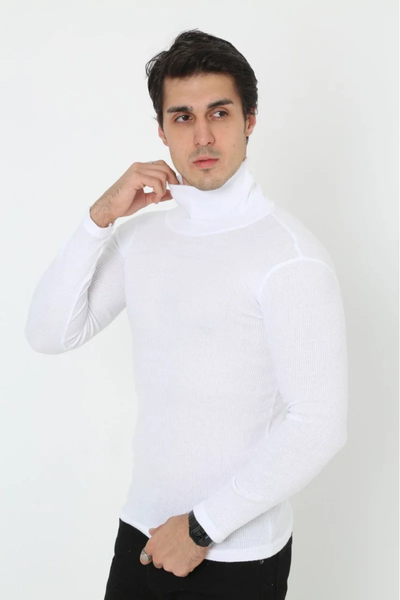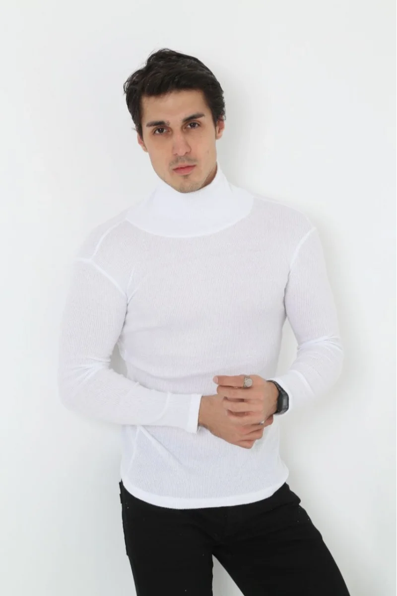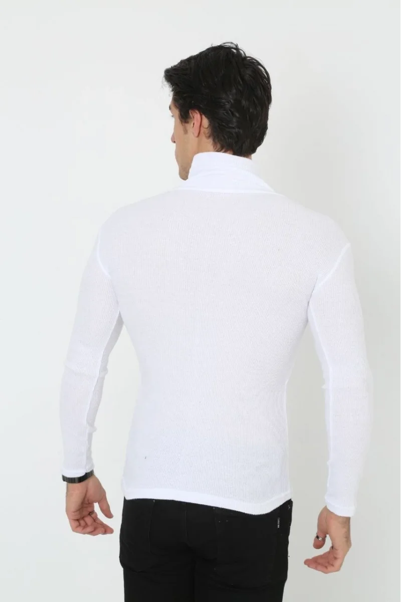 Erkek Kaşkorse Boğazlı Full Likralı Fitilli Body Kazak - Beyaz