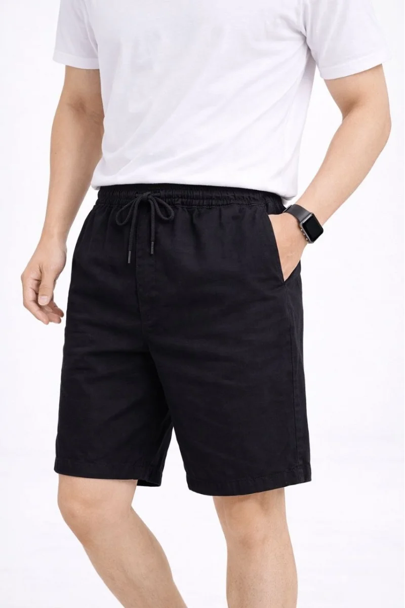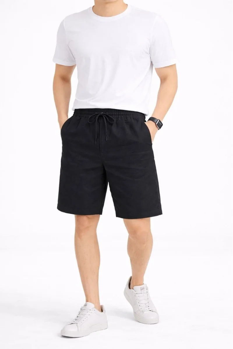 Erkek Keten Kumaş Cepli Rahat Kesim Bel Lastikli Şort - Siyah