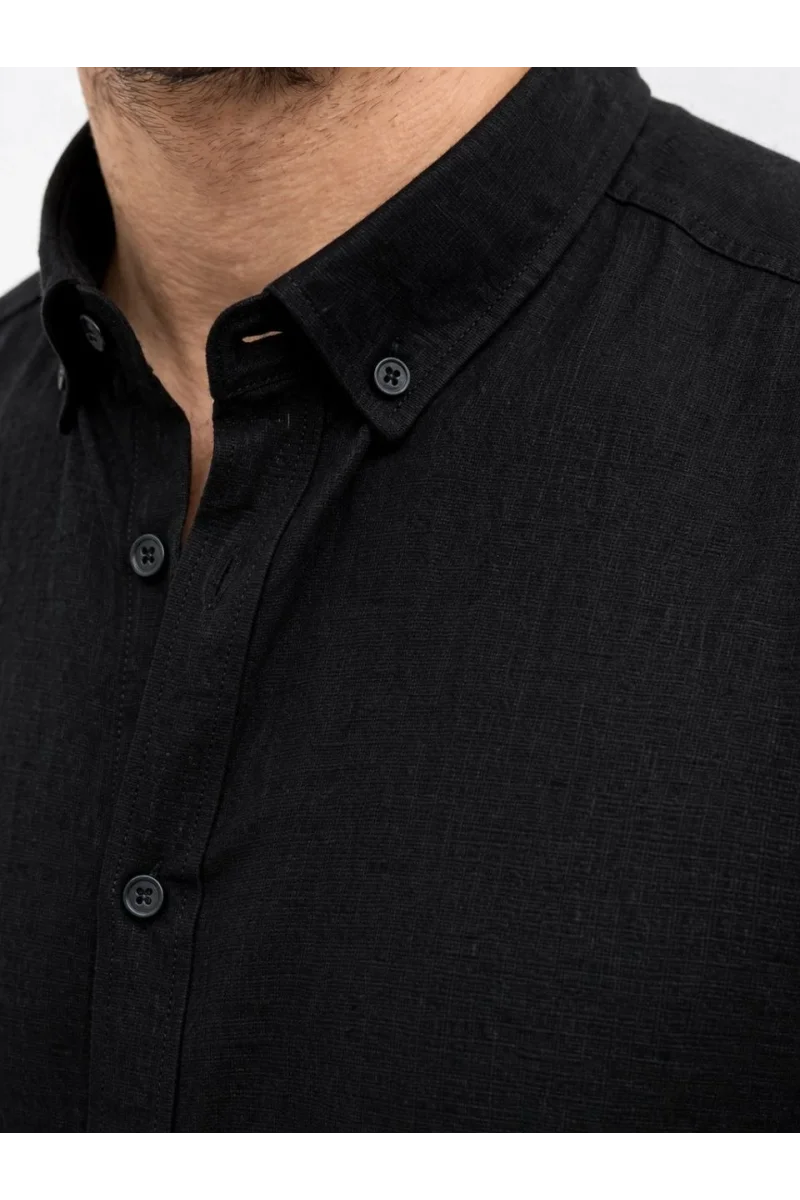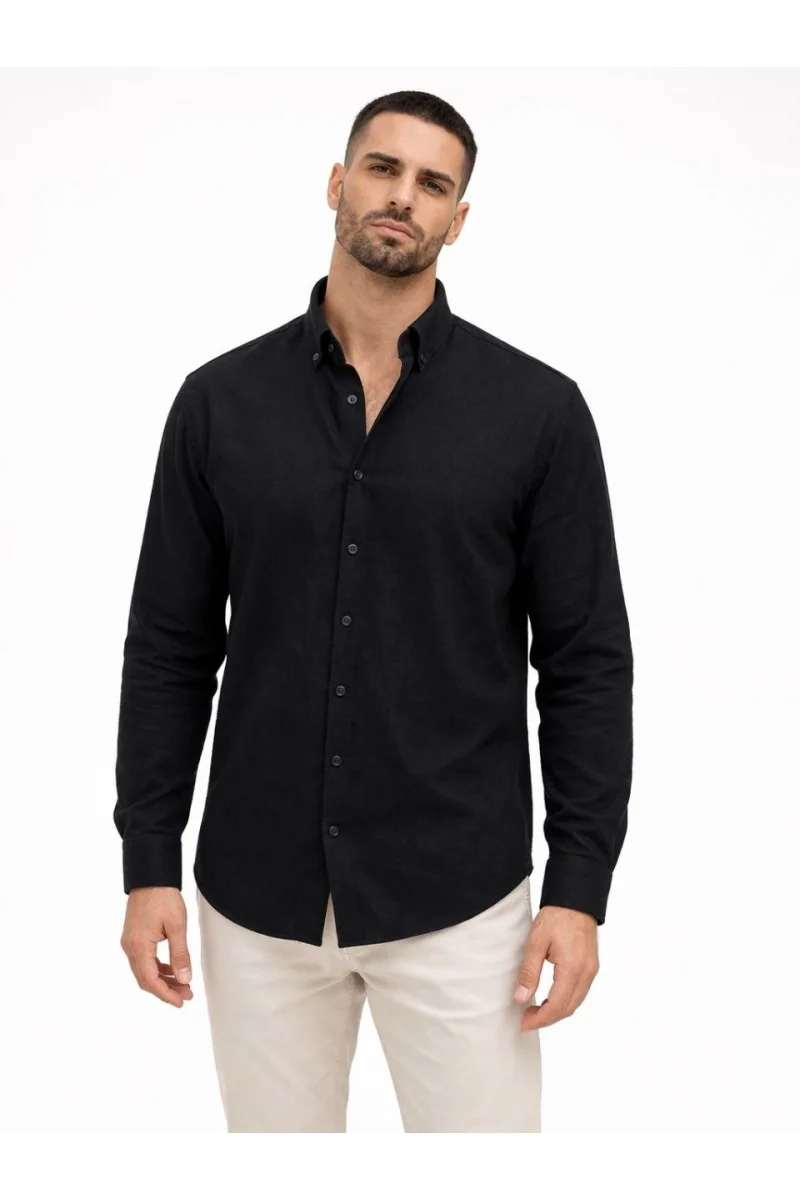 Erkek KETEN Kumaş Oversize Uzun Kollu Rahat Kalıp Gömlek - Siyah