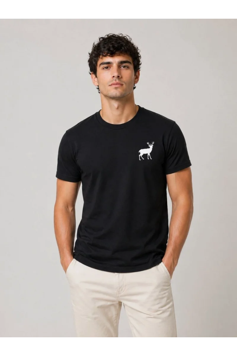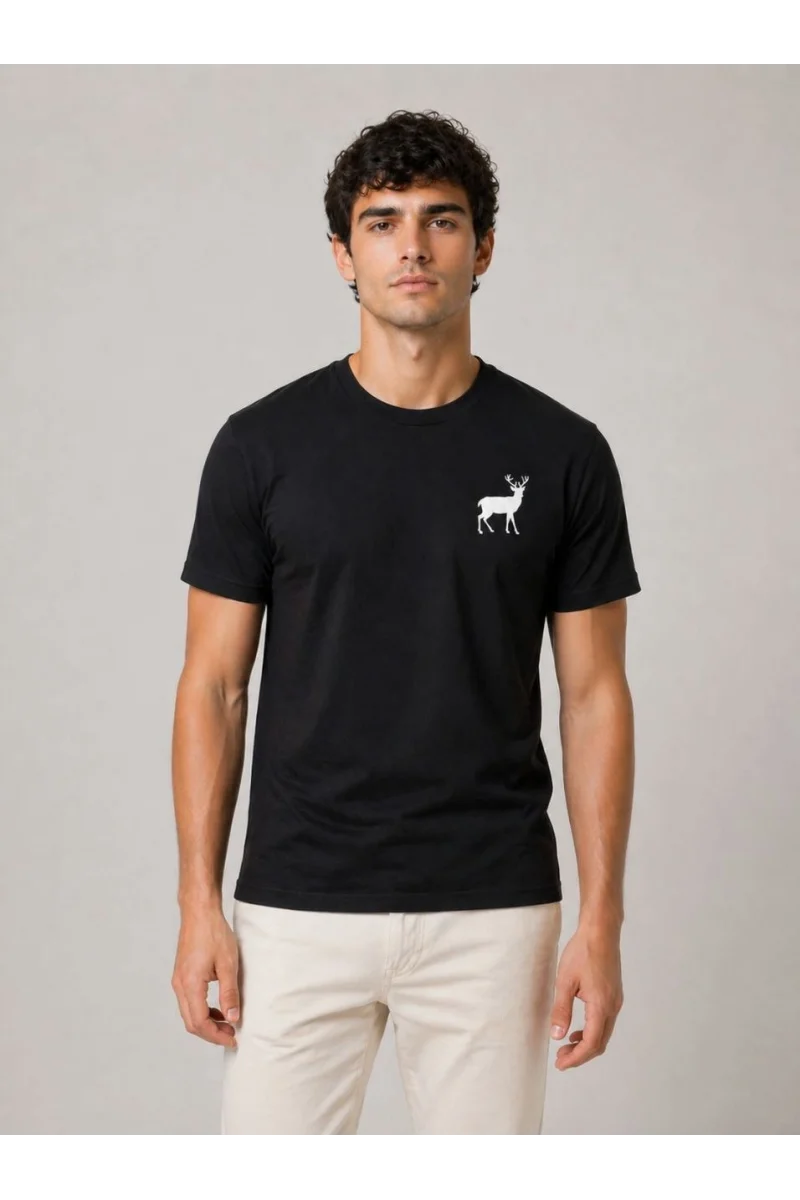 Erkek Minimal Geyik Logolu Tişört Bisiklet Yaka Kısa kol Yazlık T-Shirt - Siyah