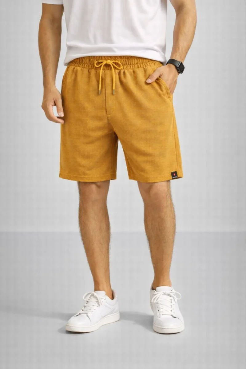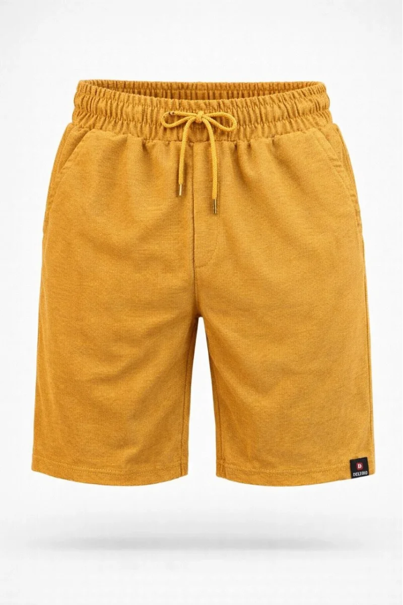 Erkek otoban Dokuma Şort Beli Lastikli Bağcıklı, Cepli, Rahat Kesim Günlük Yazlık Şort - Hardal