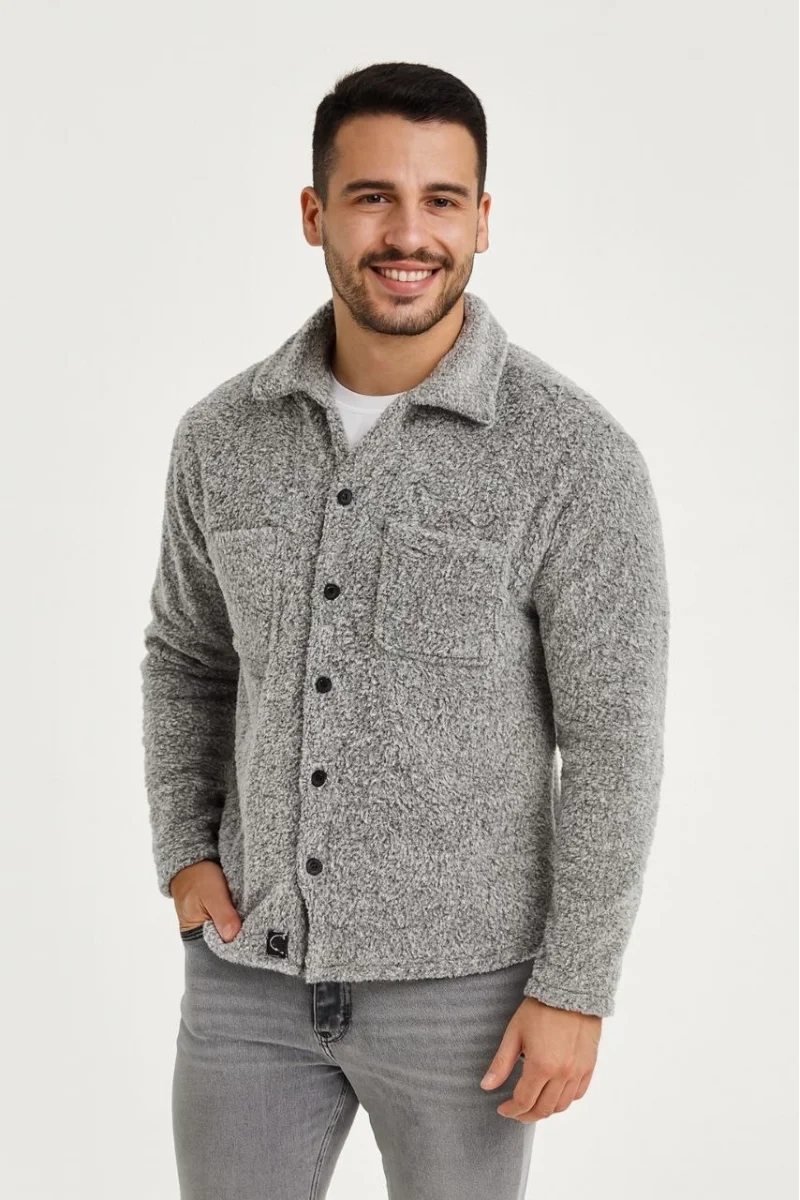 Erkek Pelüş Polar Hırka Gömlek – Yakalı, İlik Düğmeli, Göğüs Cepli, Yumuşak Dokulu Kışlık Regular Fit Rahat Günlük Model - Gri
