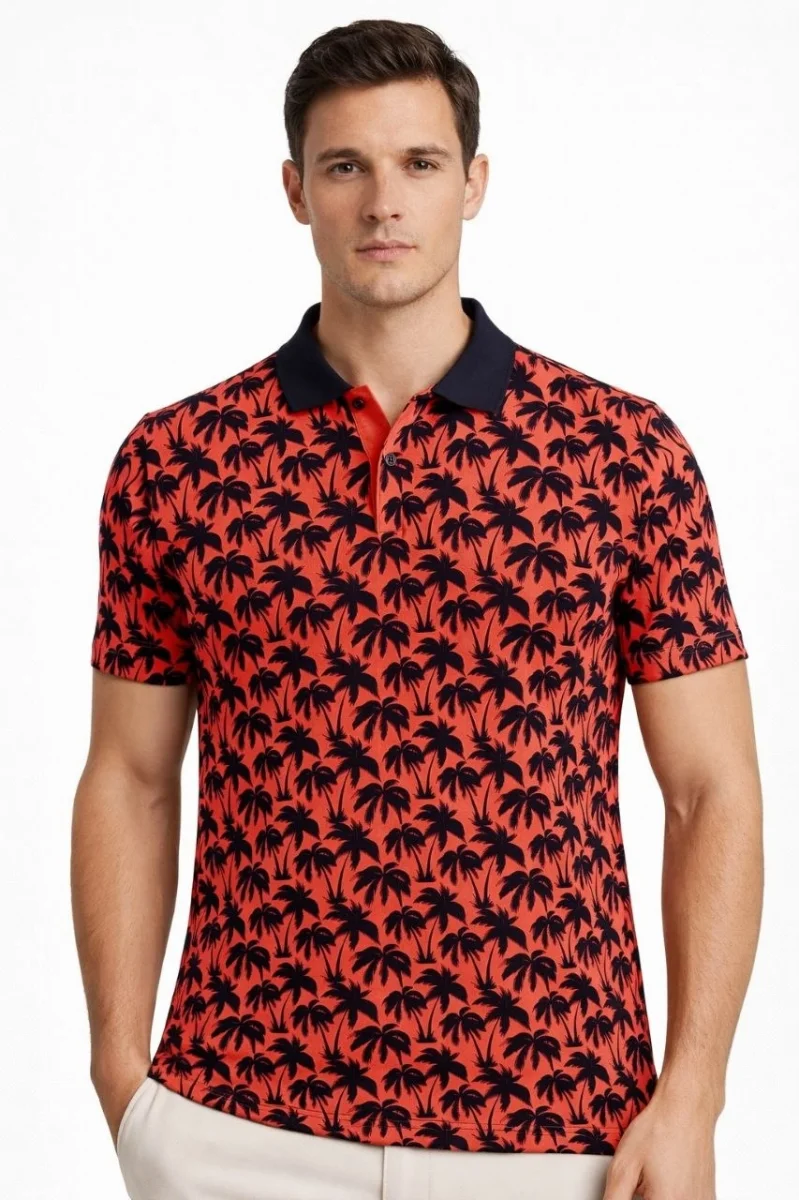 Erkek Pike Kumaş Polo Yaka Palmiye Desenli Tişört Kısa Kol Yazlık T-Shirt - Kırmızı