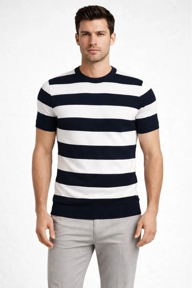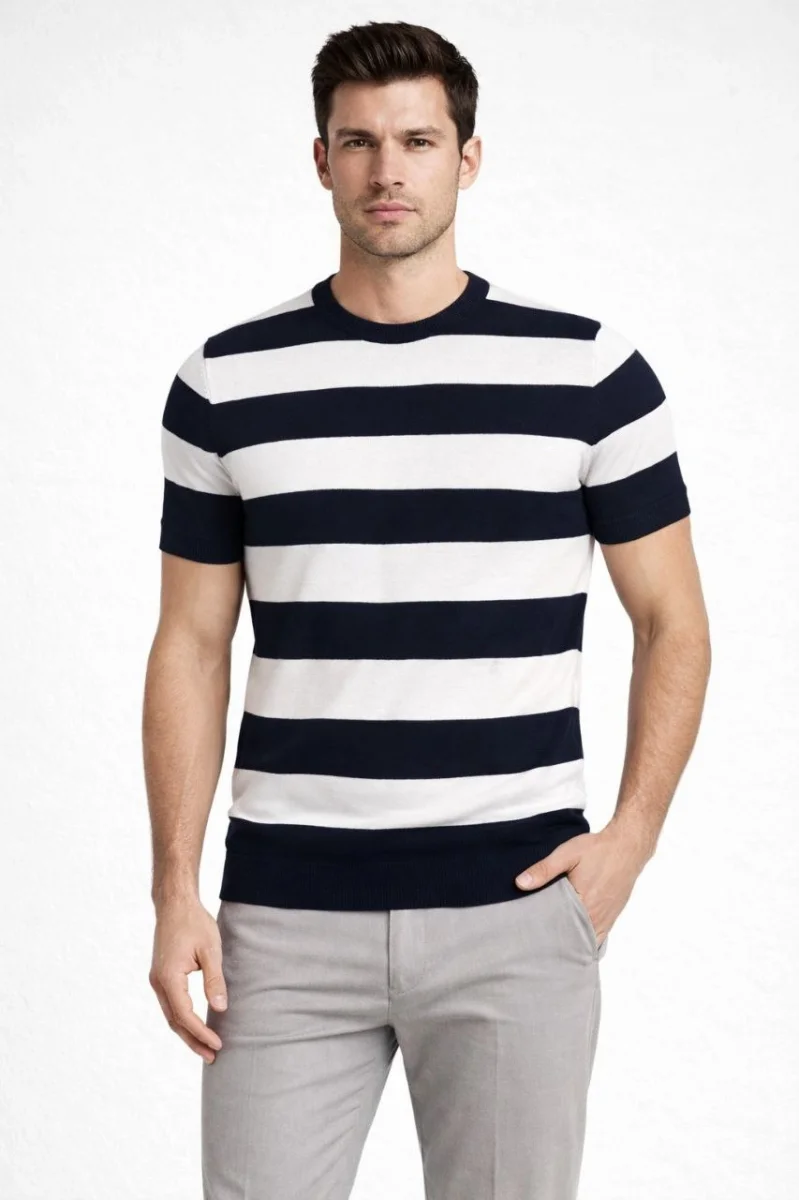 Erkek T-shirt Çizgili Triko Dokuma Bisiklet Yaka Tişört - Siyah