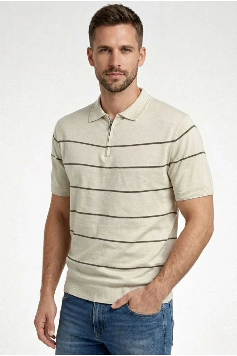 Erkek T-shirt Çizgili Triko Dokuma Kumaş Polo Yaka Yarım Fermuarlı Regular Kalıp Tişört - Bej