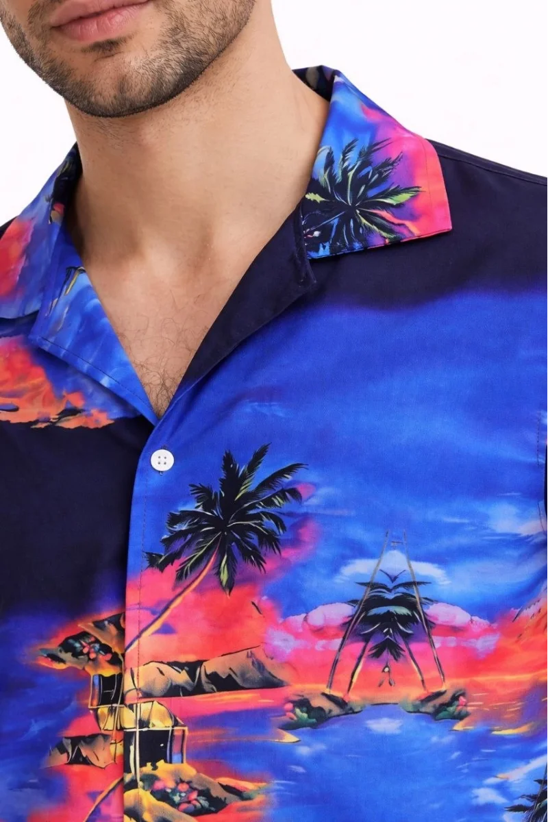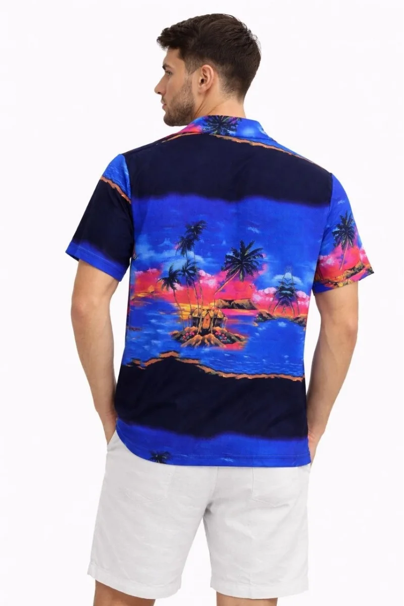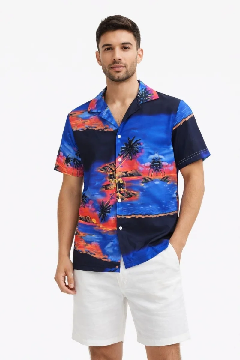 Erkek Tropikal Ada Manzara Desenli Kısa Kol Gömlek Hawaii Tarz Yazlık Rahat Kalıp - Desenli