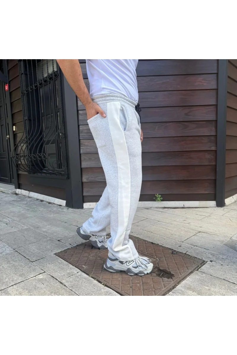 Erkek Üç İplik Kışlık Pamuklu Yandan Garneli Kalın Bej Şeritli Cepli Eşofman Altı - Gri