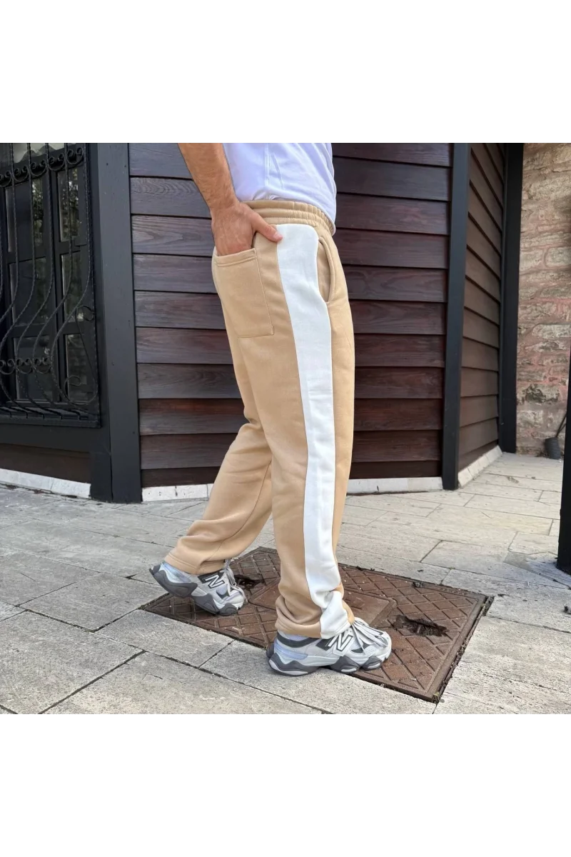 Erkek Üç İplik Kışlık Pamuklu Yandan Garneli Kalın Şeritli Cepli Eşofman Altı - Bej