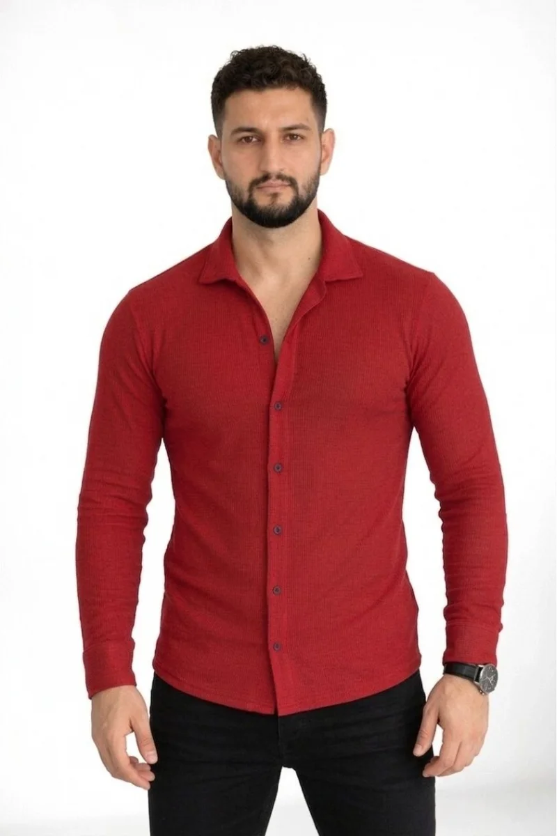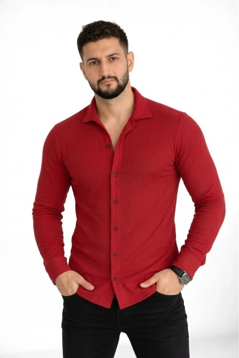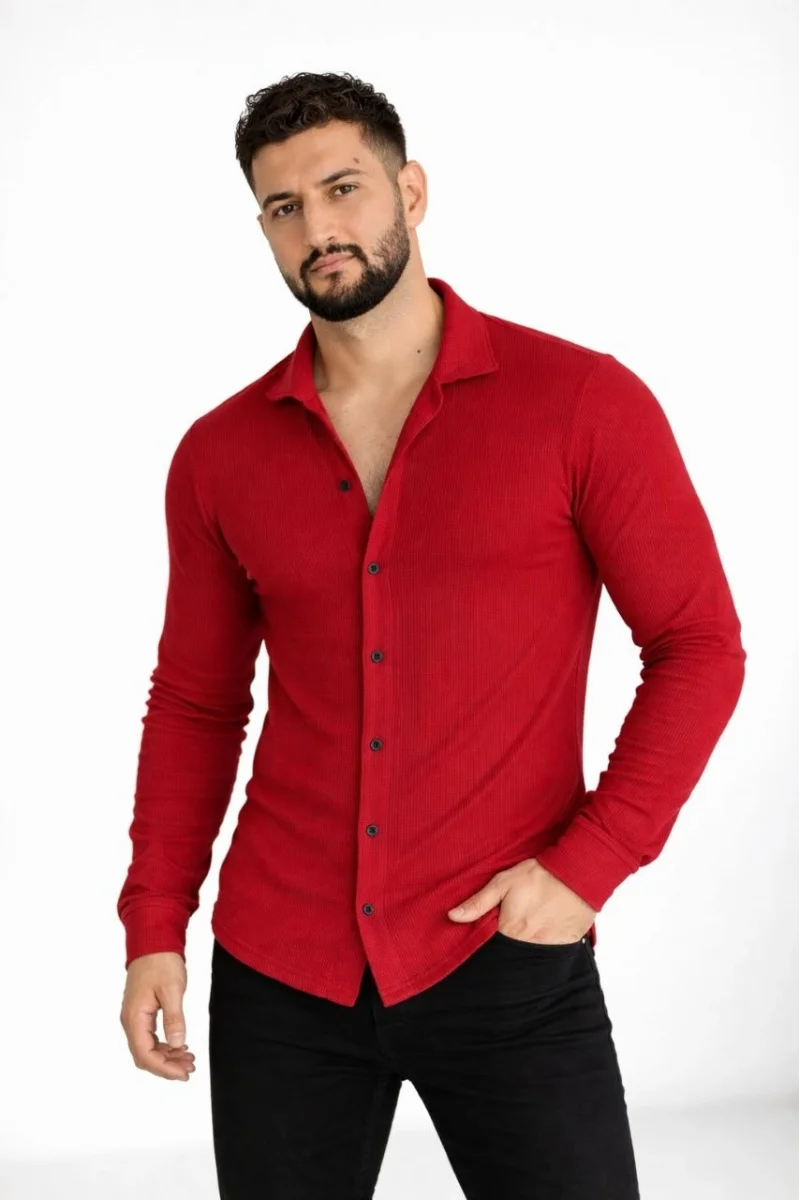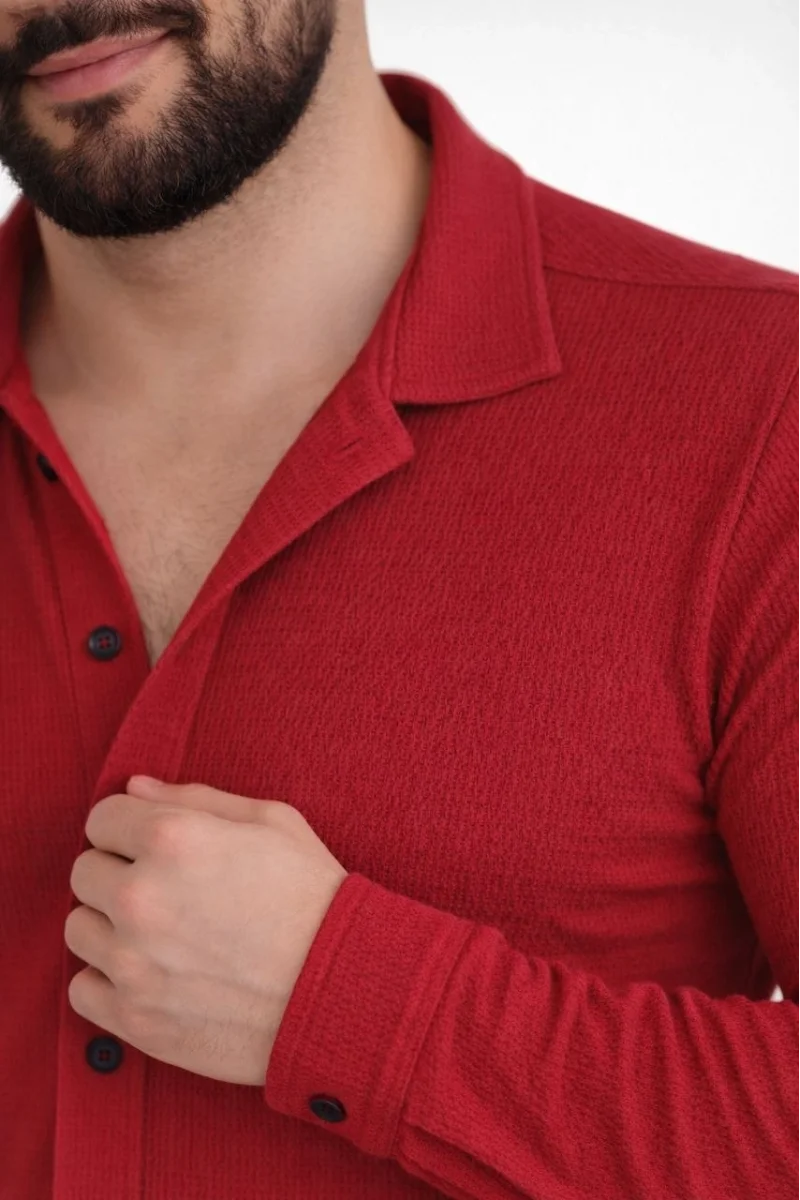 Erkek Waffle Kumaş Uzun Kollu Düğmeli Açık Yaka Regular Fit Gömlek - Kırmızı