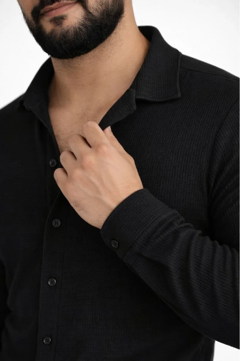 Erkek Waffle Kumaş Uzun Kollu Düğmeli Açık Yaka Regular Fit Gömlek - Siyah