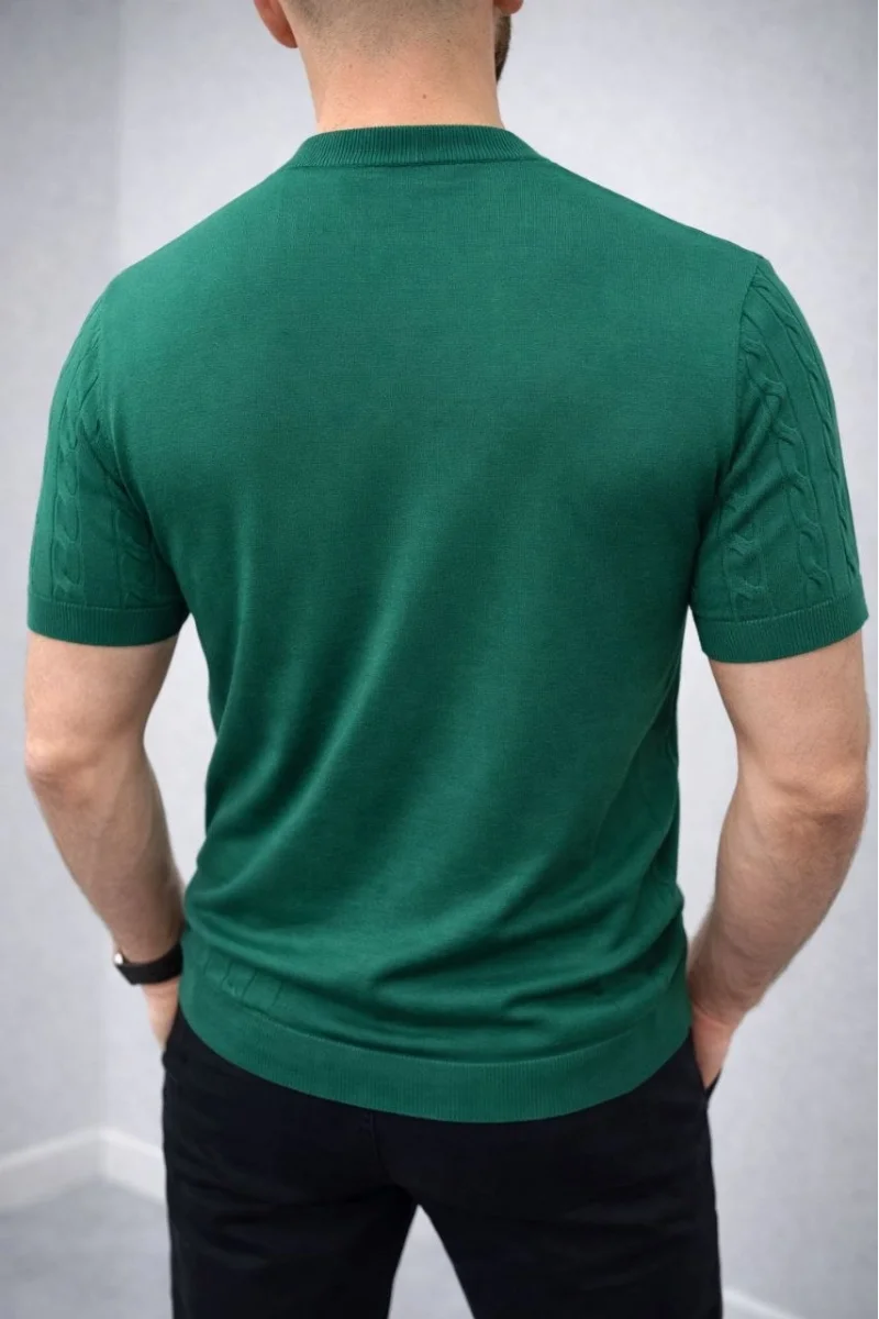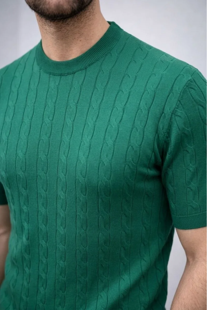 Erkek Yazlık Triko Dokuma Tişört Kısa Kol Bisiklet Yaka Örgü Desenli T-Shirt - Haki
