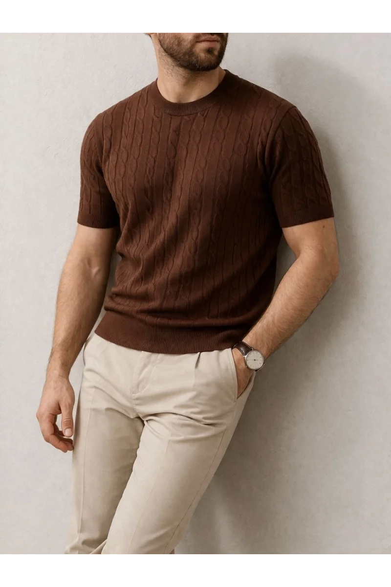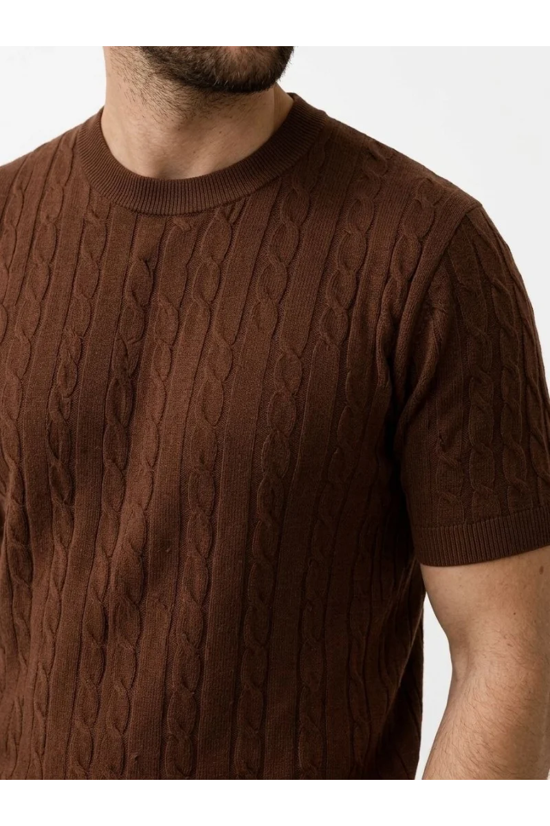 Erkek Yazlık Triko Dokuma Tişört Kısa Kol Bisiklet Yaka Örgü Desenli T-Shirt - Kahverengi