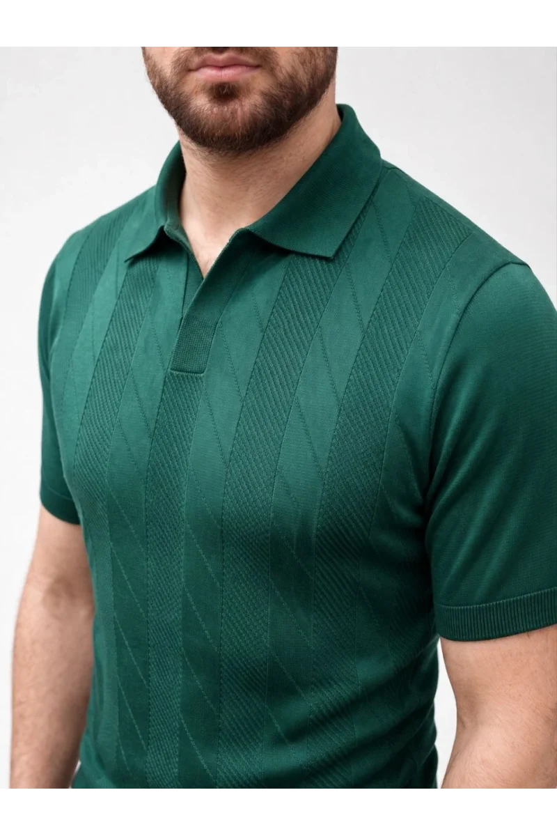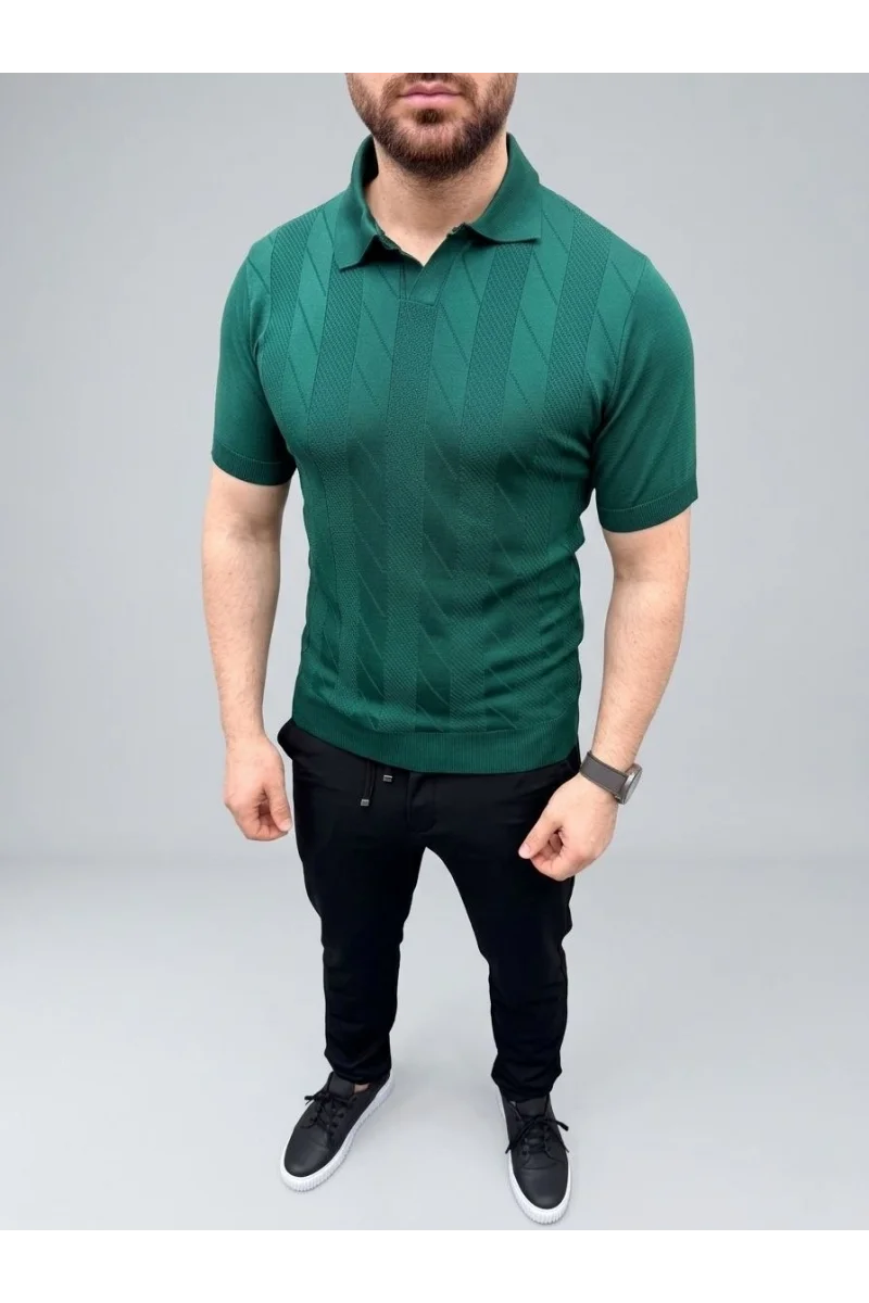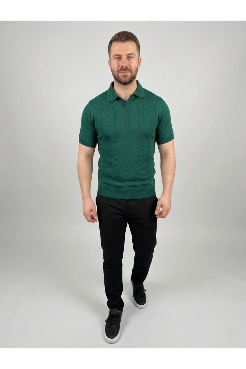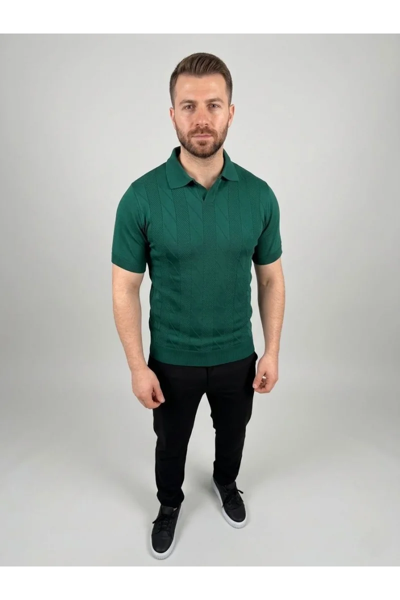 Erkek Yazlık Triko Dokuma Tişört Kısa Kol Polo Yaka T-Shirt - Koyu Yeşil