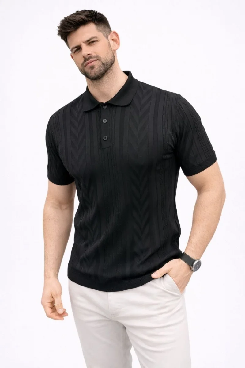 Erkek Yazlık Triko Tişört Kısa Kol Polo Yaka Düğmeli T-Shirt - Siyah