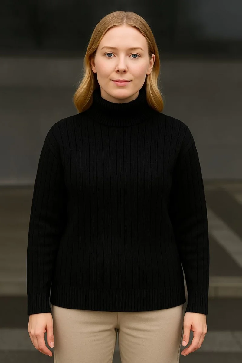 Kadın Balıkcı Yaka Bağazlı Triko Kazak Pamuklu Kalın Fitilli Dokuma - Siyah
