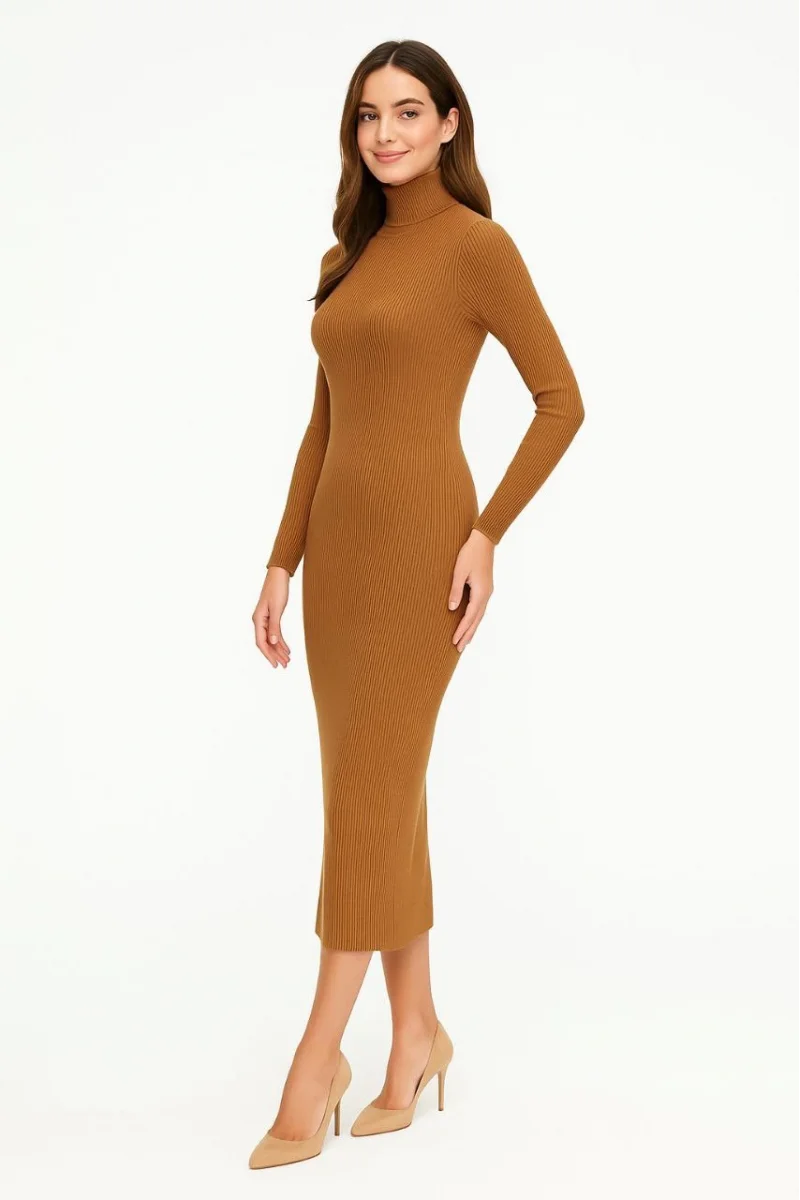 Kadın Boğazlı Triko Elbise – Uzun Fitilli Esnek Dokuma, Tam Kalıp, Kışlık & Baharlık Şık Rahat Stil, 130 cm Midi Boy Elbise - Kahverengi