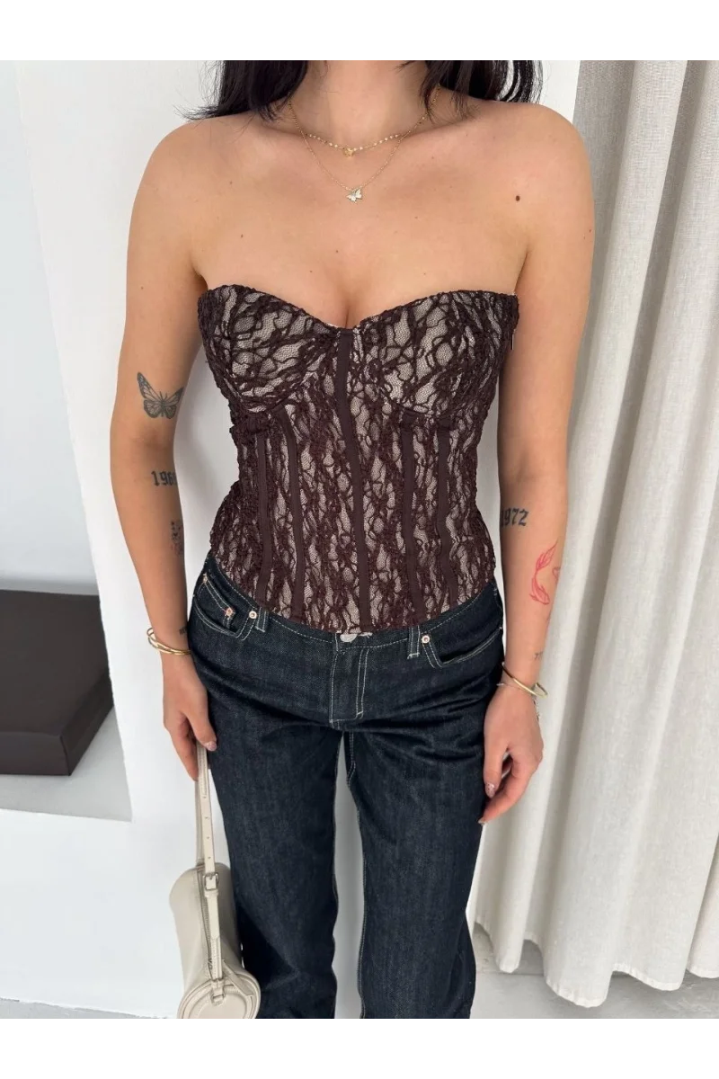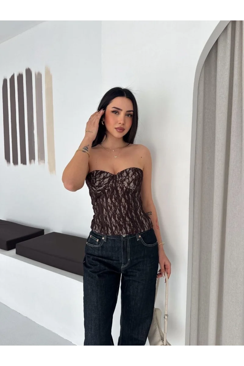 Kadın Fermuarlı Dantel Korse Straplez Bustiyer Transparan Şık Top - Kahverengi