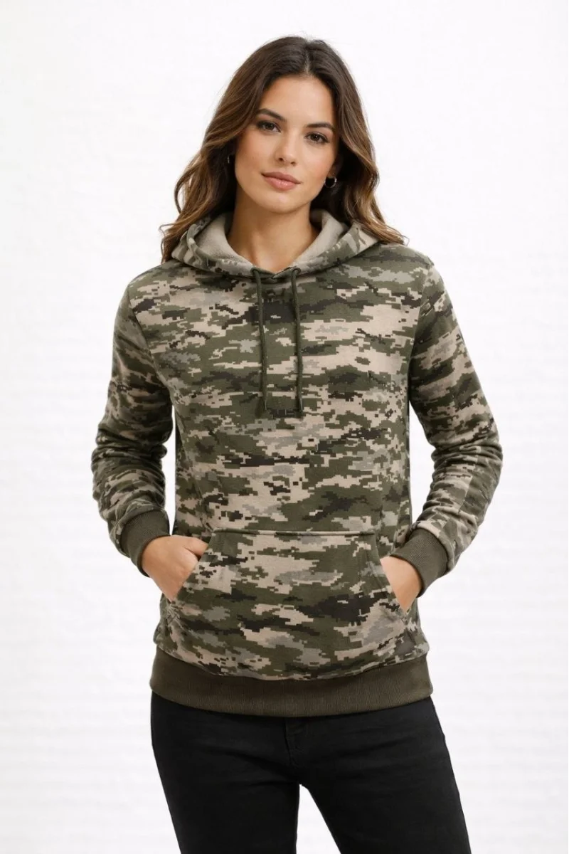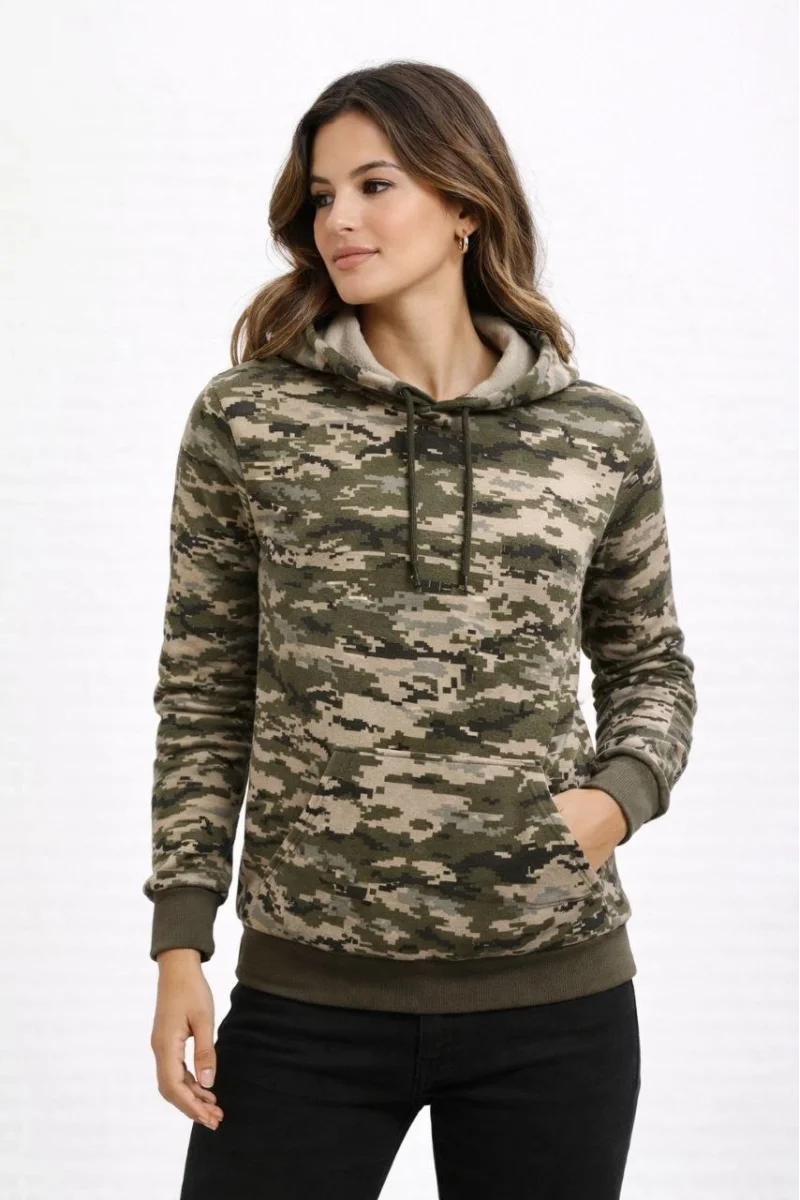 Kadın Kamuflaj Desenli 2 İplik 4 Mevsim Kapüşonlu Kanguru Cepli Hoodie Sweatshirt - Kamuflaj