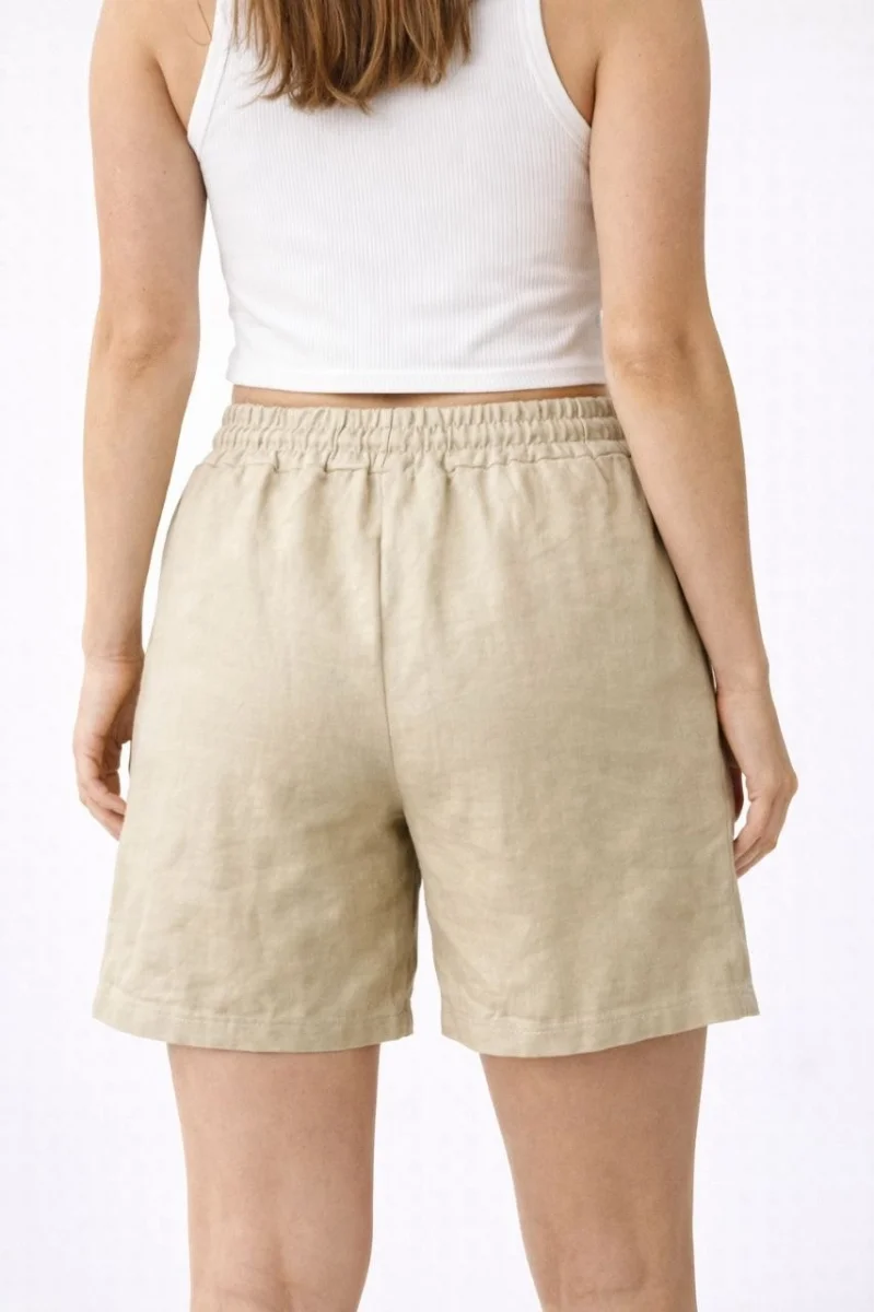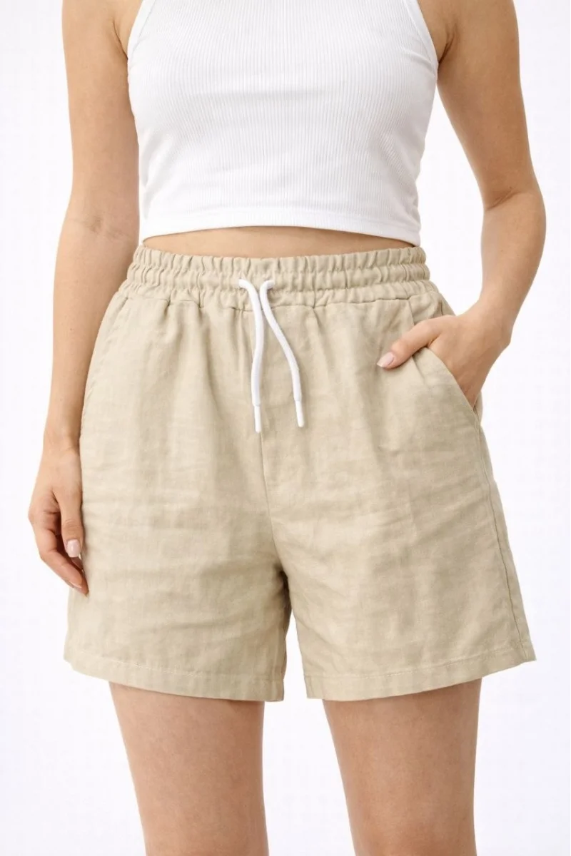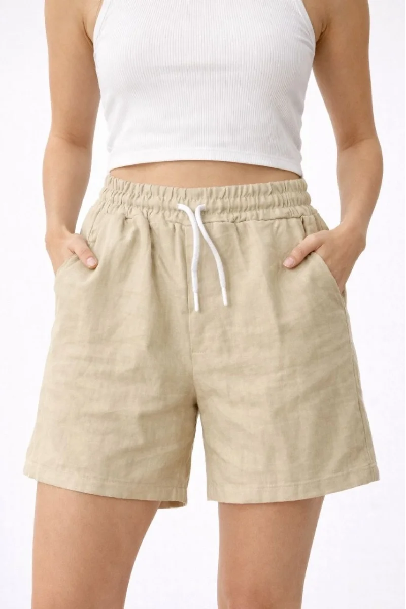 Kadın Keten Kumaş Cepli Rahat Kesim Bel Lastikli Şort - Bej