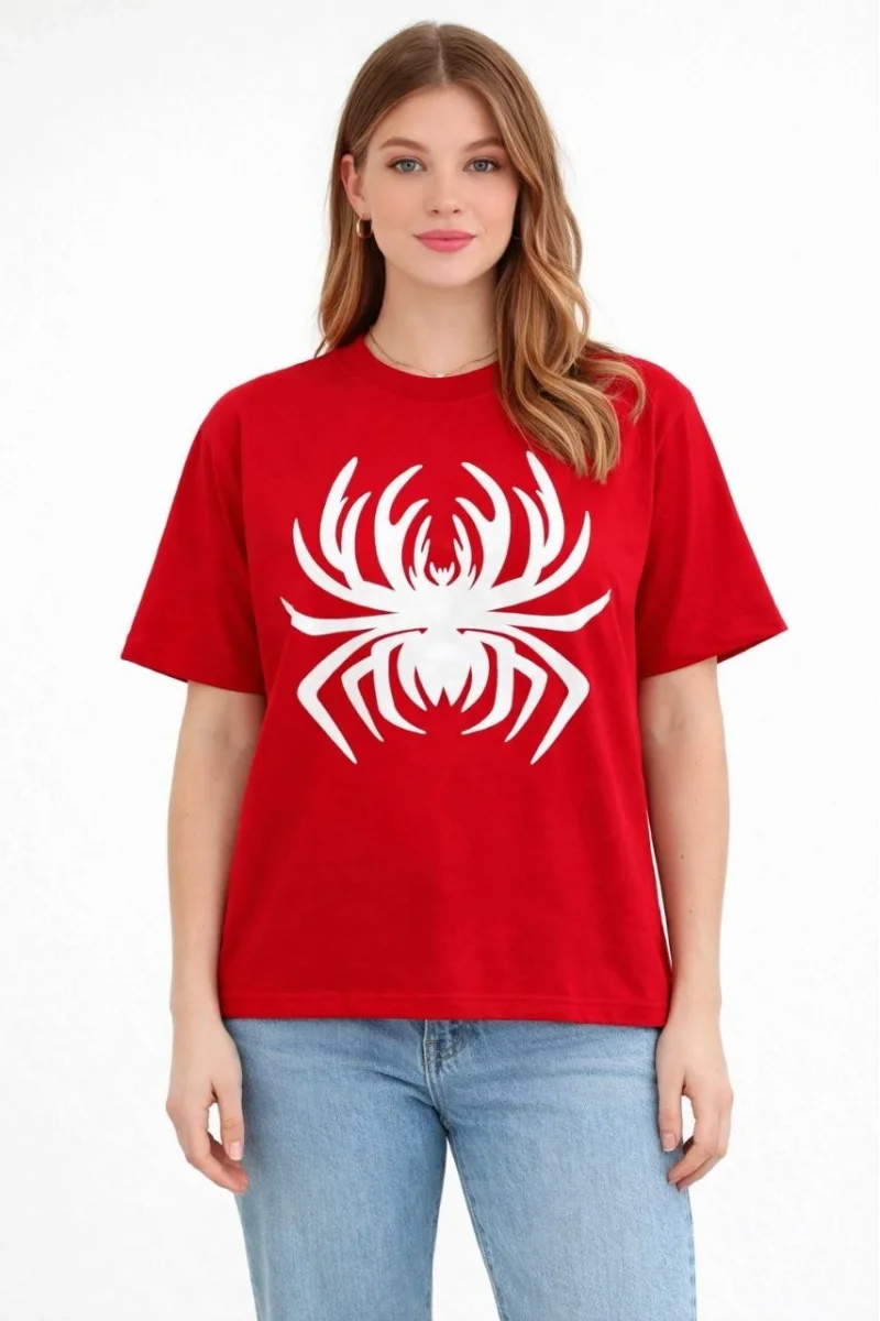 Kadın Örümcek Baskılı Tişört Kısa Kollu Bisiklet Yaka T-Shirt - Kırmızı