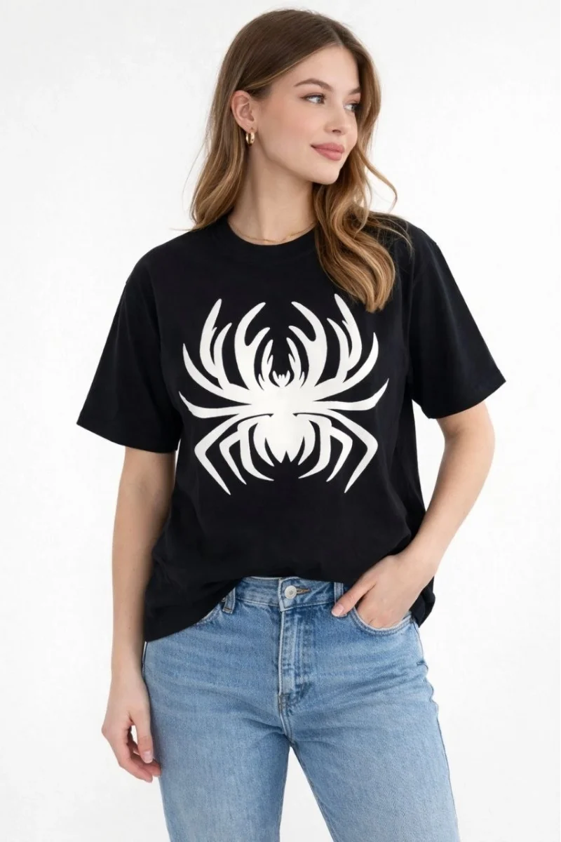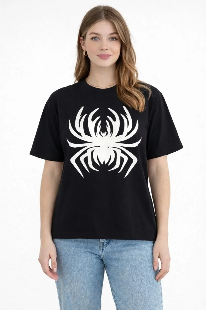Kadın Örümcek Baskılı Tişört Kısa Kollu Bisiklet Yaka T-Shirt - Siyah