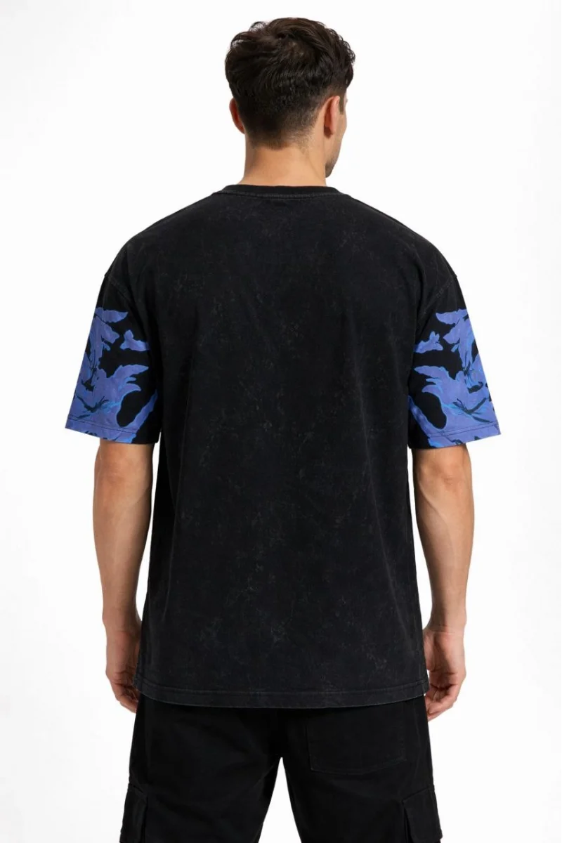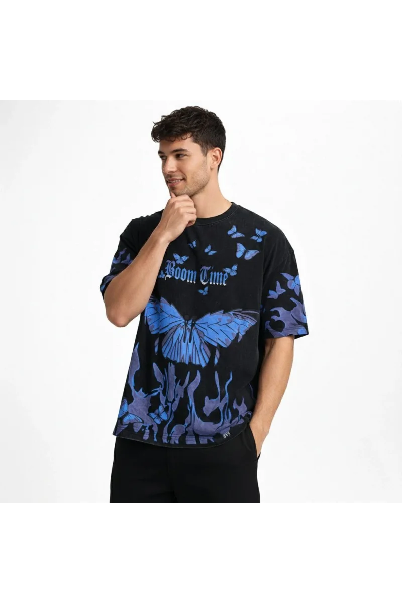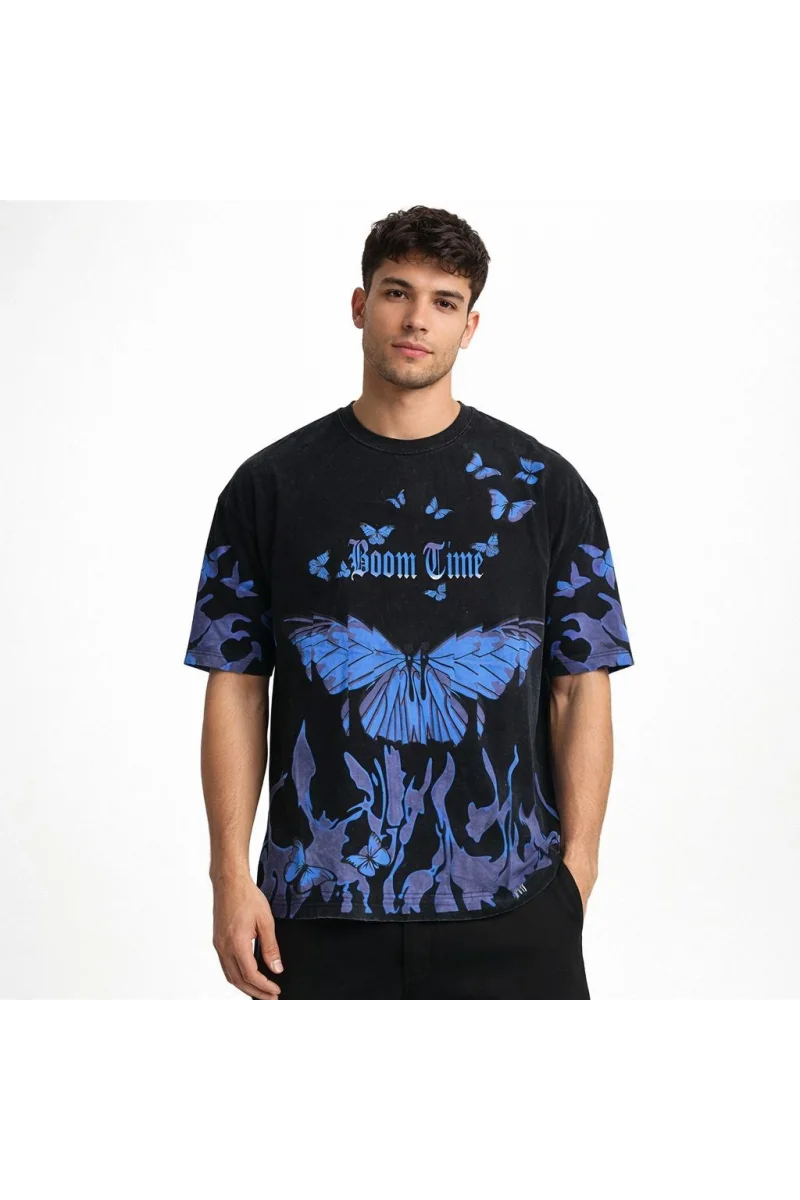 Erkek Asit Yıkamalı Oversize Tişört Mavi Kelebek Baskılı Dijital Print Bisiklet - Siyah