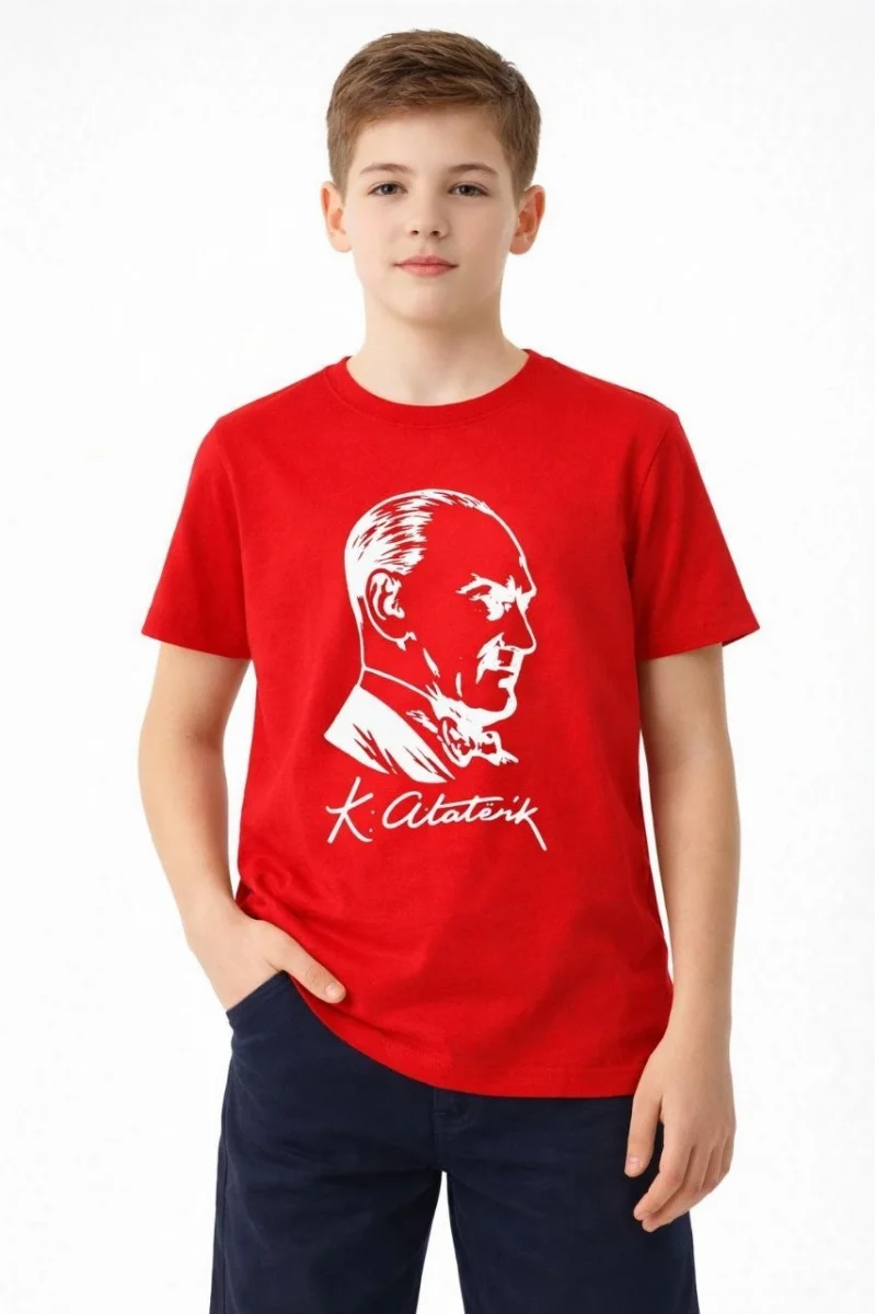 Erkek Çocuk Atatürk Baskılı Tişört Kısa Kollu Bisiklet Yaka T-Shirt - Kırmızı