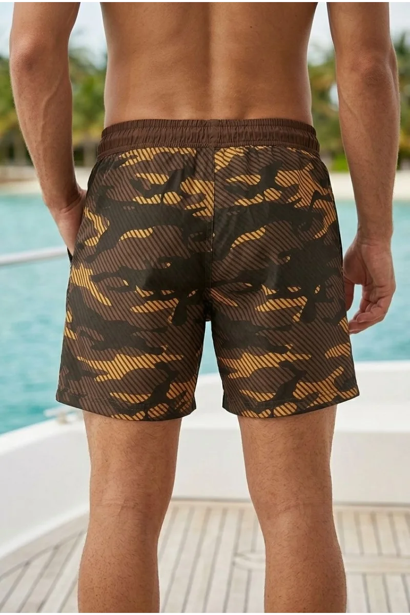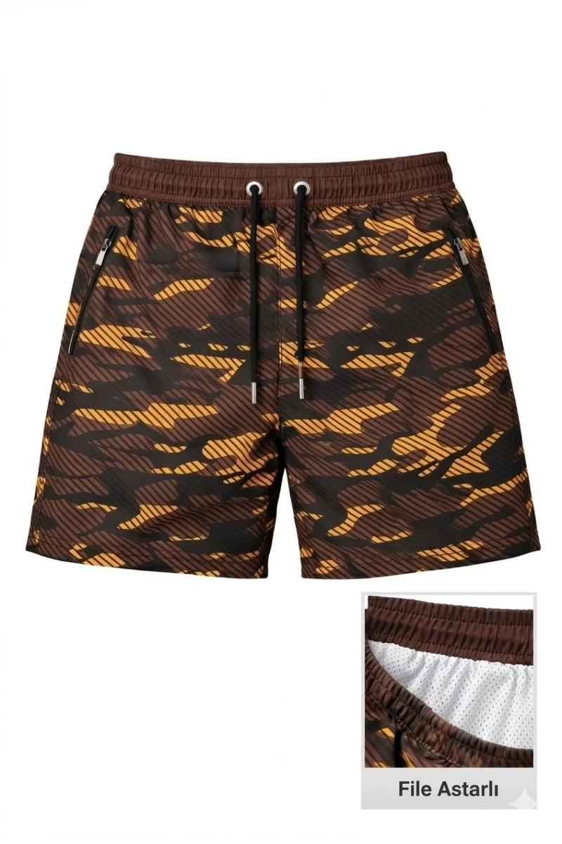 Erkek Deniz Şortu Fermuarlı Cepli File Astarlı Hızlı Kuruyan Premium - Kahverengi