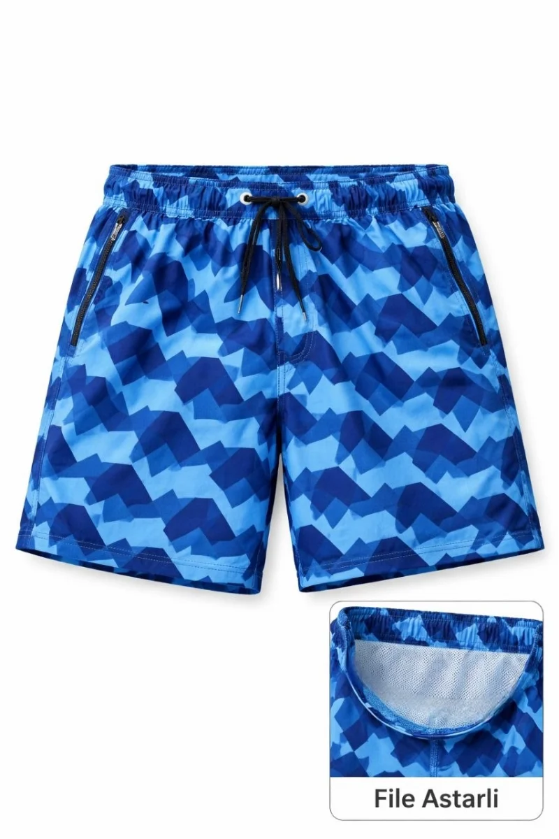 Erkek Deniz Şortu Fermuarlı Cepli File Astarlı Hızlı Kuruyan Premium - Mavi