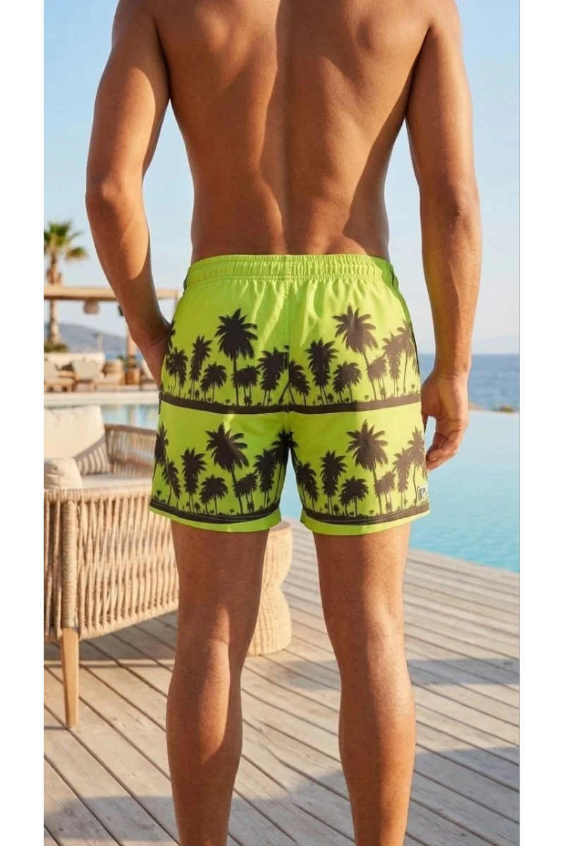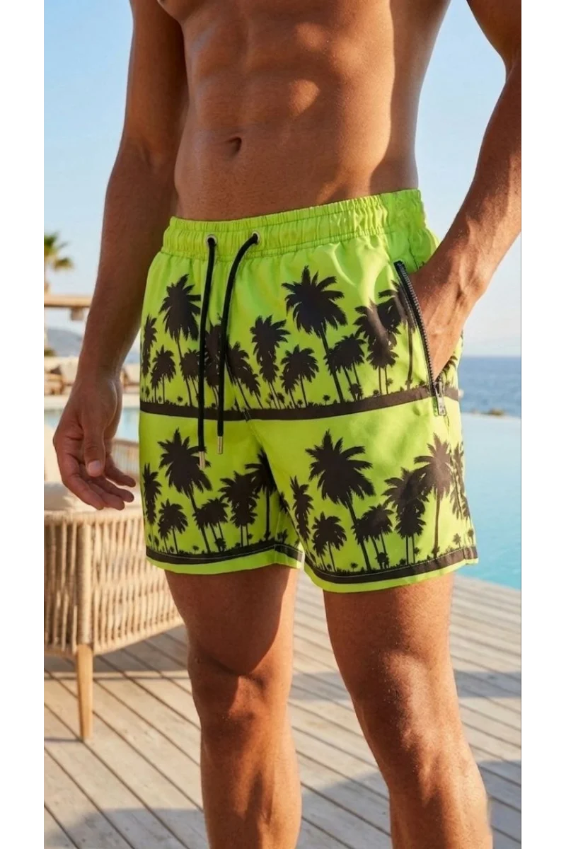 Erkek Deniz Şortu Fermuarlı Cepli File Astarlı Hızlı Kuruyan Premium - Neon Yeşili