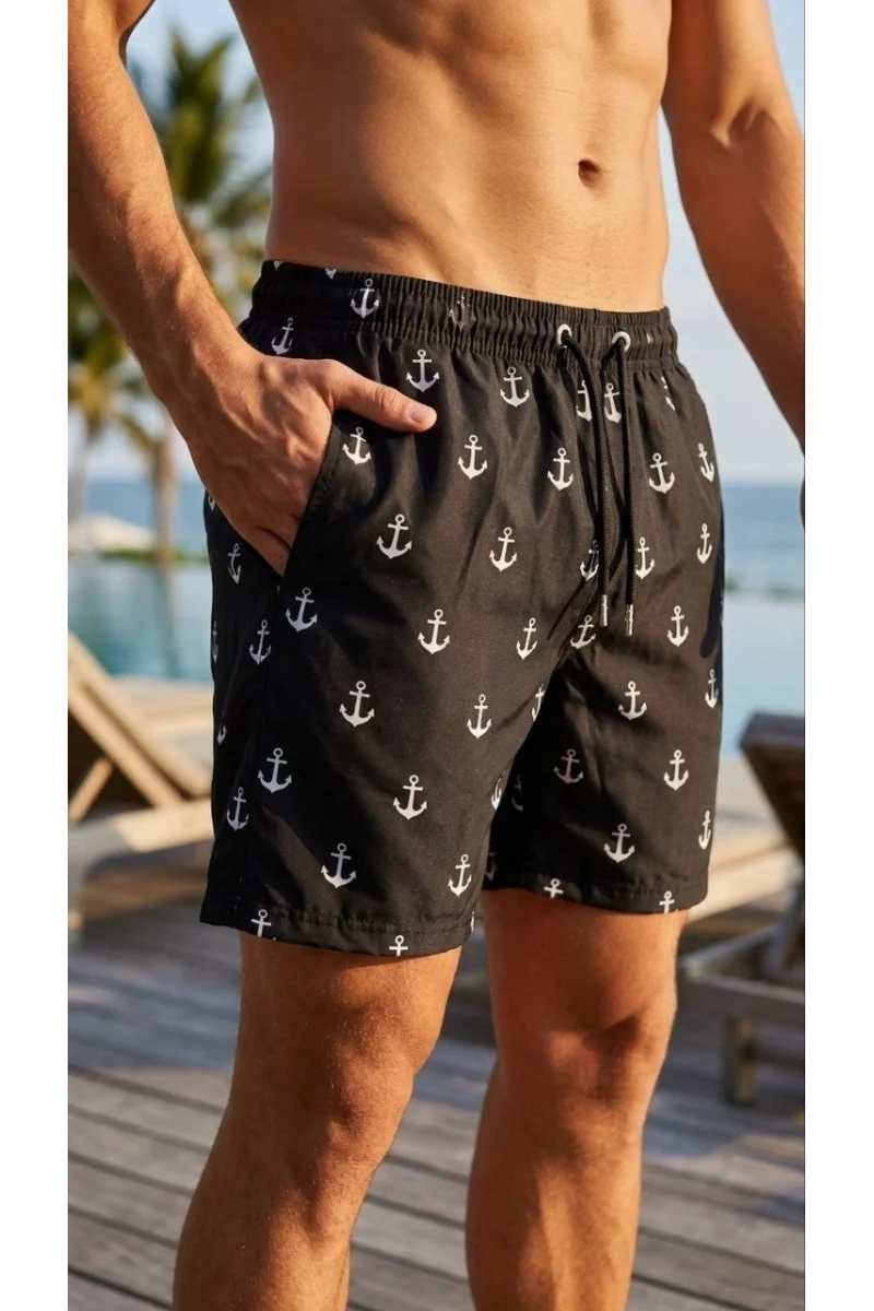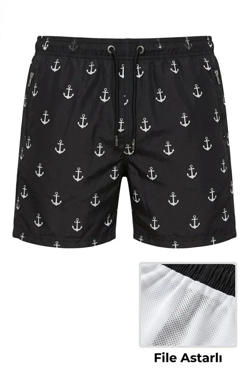 Erkek Deniz Şortu Fermuarlı Cepli File Astarlı Hızlı Kuruyan Premium - Siyah