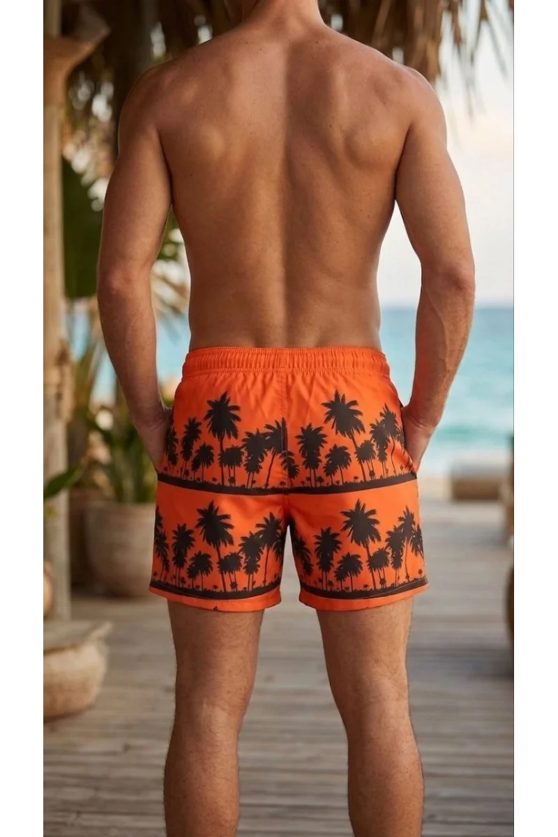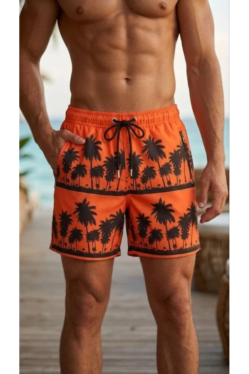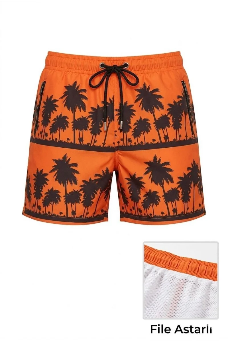 Erkek Deniz Şortu Fermuarlı Cepli File Astarlı Hızlı Kuruyan Premium - Turuncu