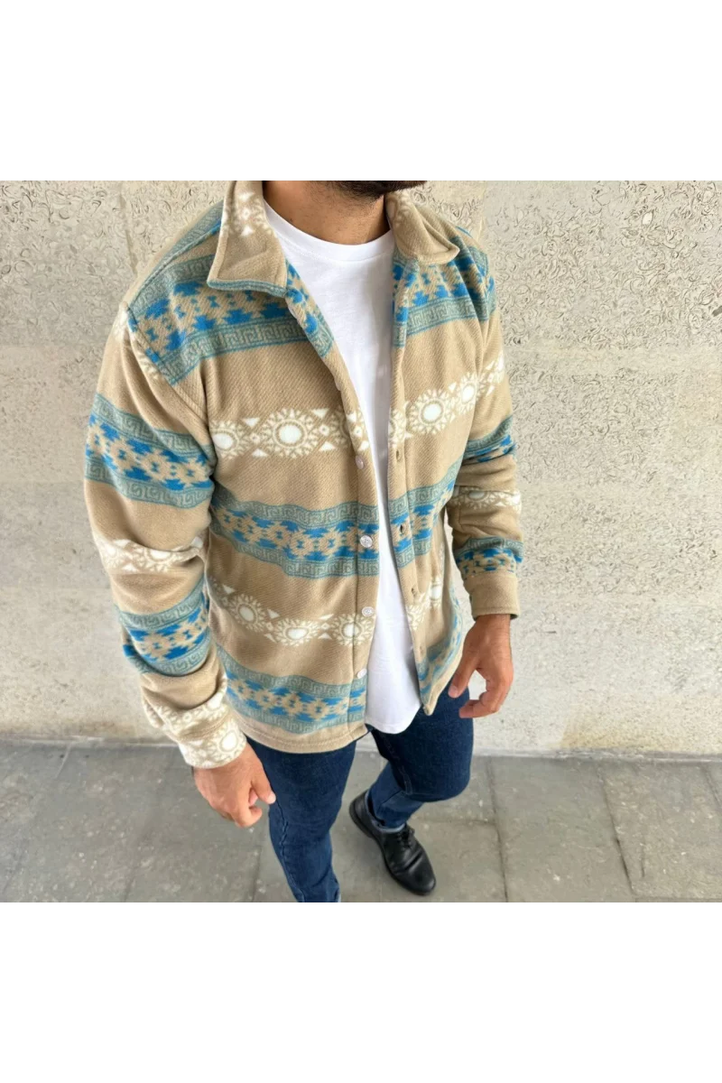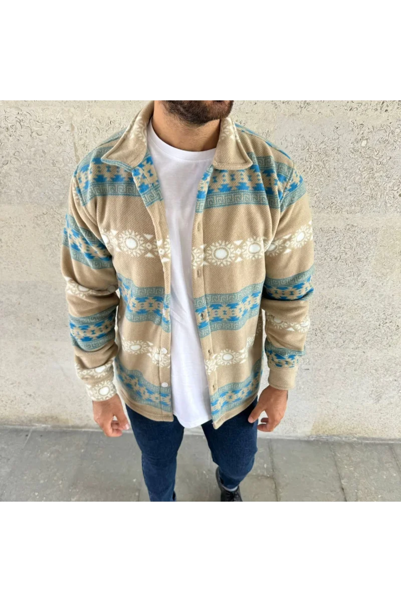 Erkek Desenli Polar Gömlek – Etnik Şerit Desen Yakalı, Uzun Kollu, Düğmeli, Oversize Rahat Kalıp - Sarı