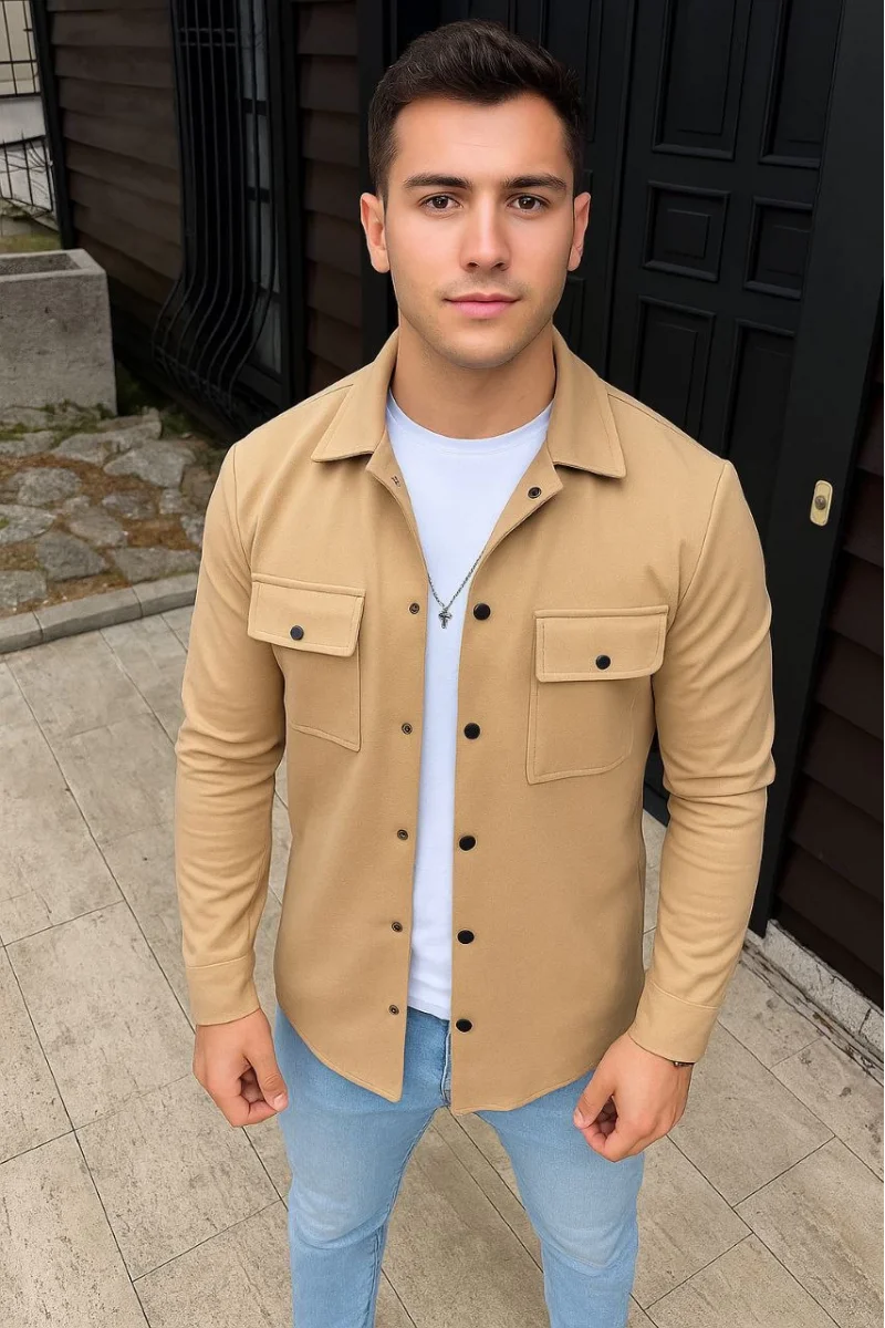 Erkek Diagonal Kumaş Cepli Çıtçıtlı uzun Kollu, Gömlek Oversize Rahat Kalıp Günlük Şık Stil - Bej