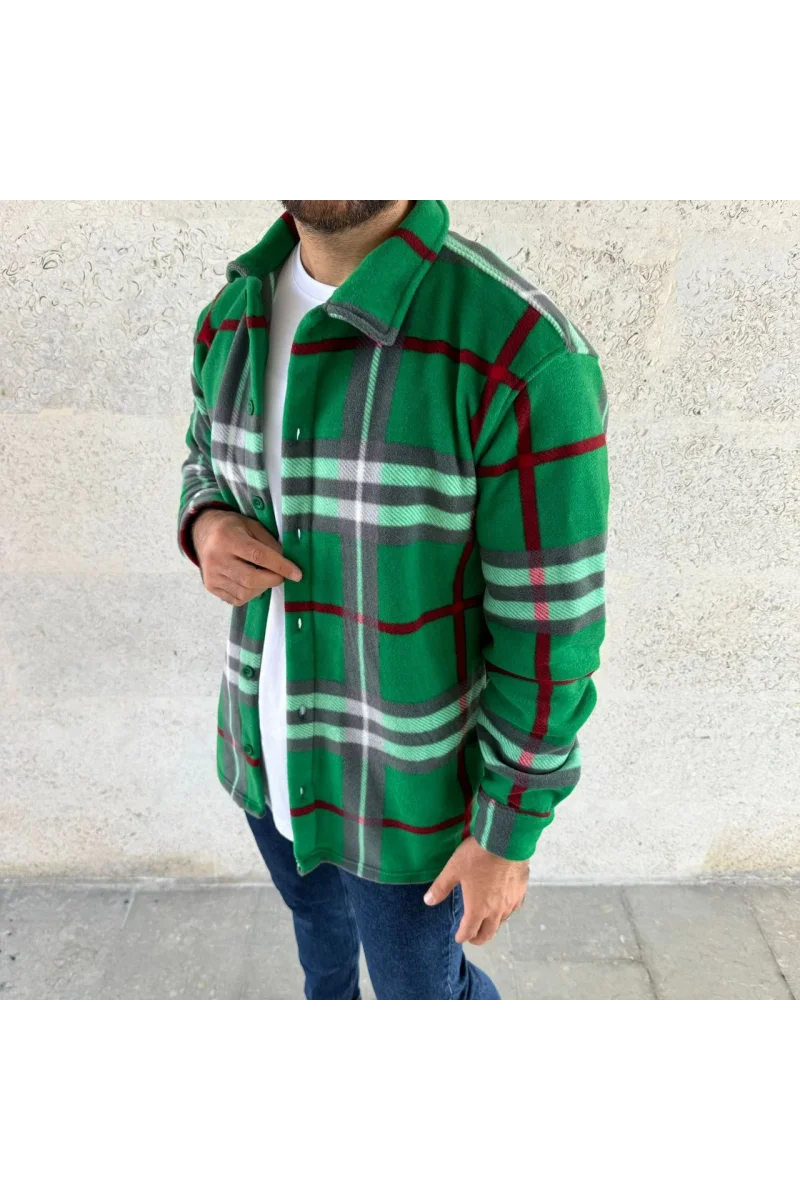 Erkek Ekose Desenli Düğmeli Polar Yakalı Uzun Kollu Gömlek Oversize Rahat Kalıp - Yeşil