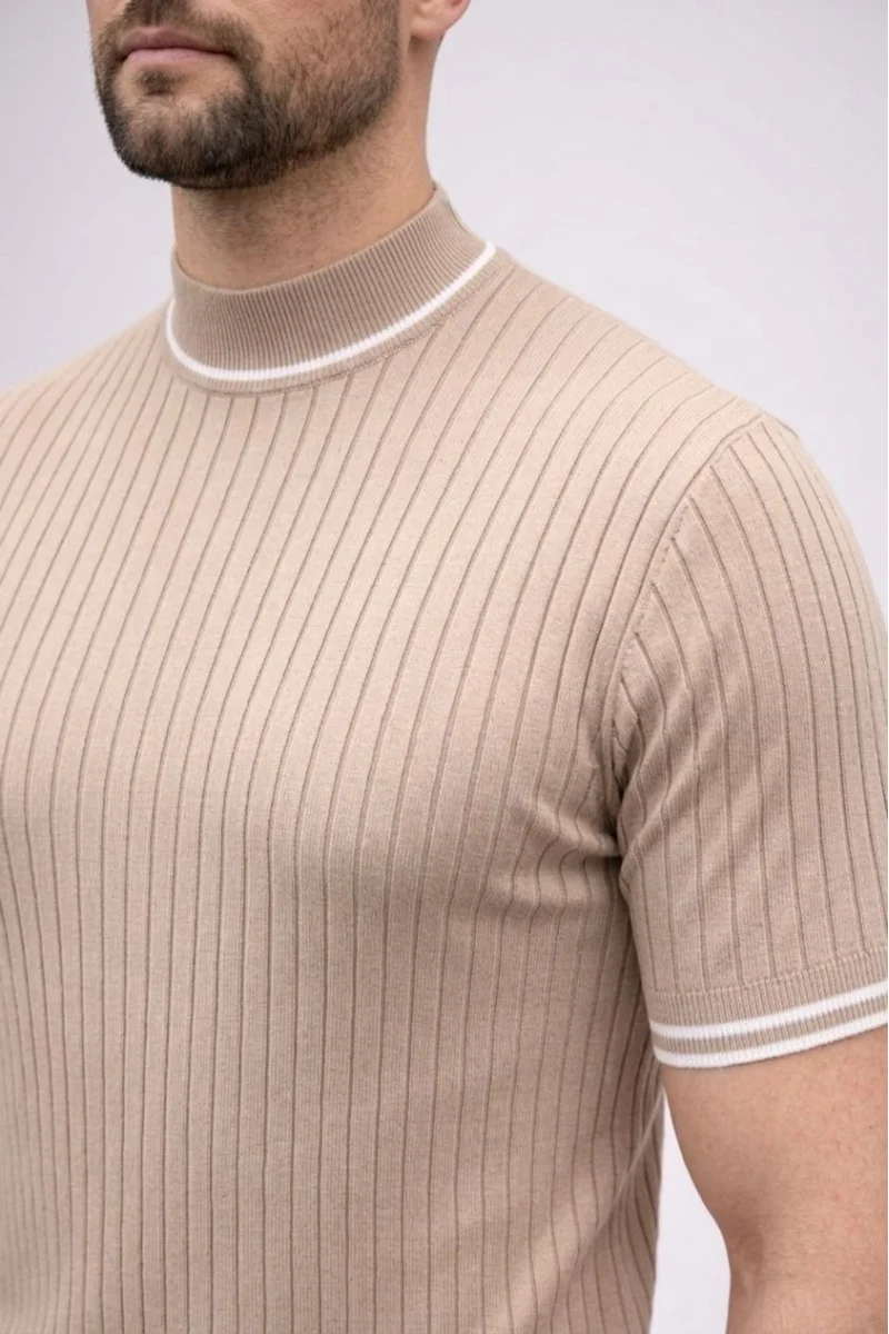 Erkek Fitilli Triko Dokuma Kısa Kol Tişört Yarım Boğaz Modern Yazlık T-Shirt - Bej