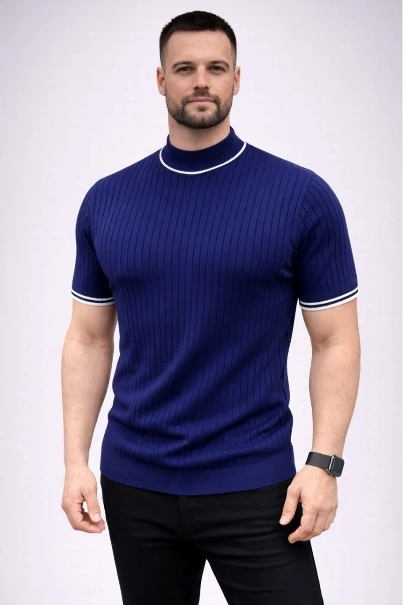 Erkek Fitilli Triko Dokuma Kısa Kol Tişört Yarım Boğaz Modern Yazlık T-Shirt - Lacivert