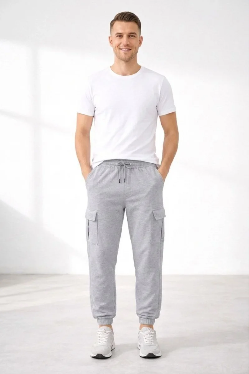 Erkek Jogger Eşofman Altı Regular Fit , Kargo Cepli, Lastikli Paça, Günlük Spor Pantolon - Gri