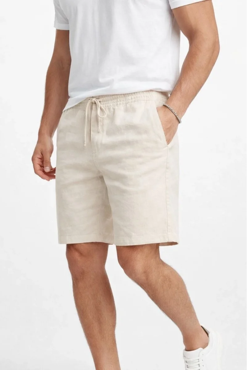 Erkek Keten Kumaş Cepli Rahat Kesim Bel Lastikli Şort - Krem