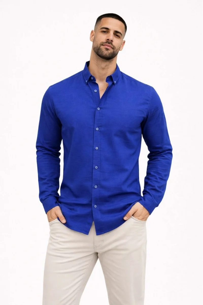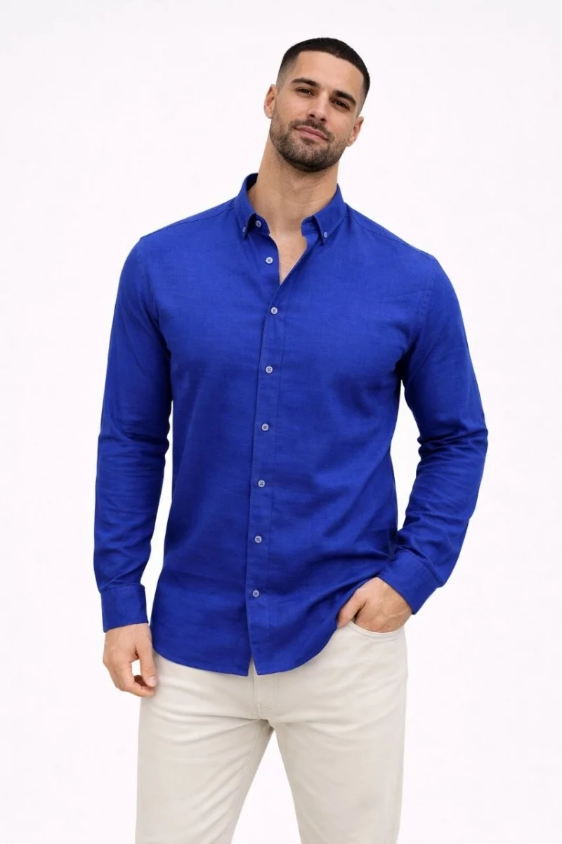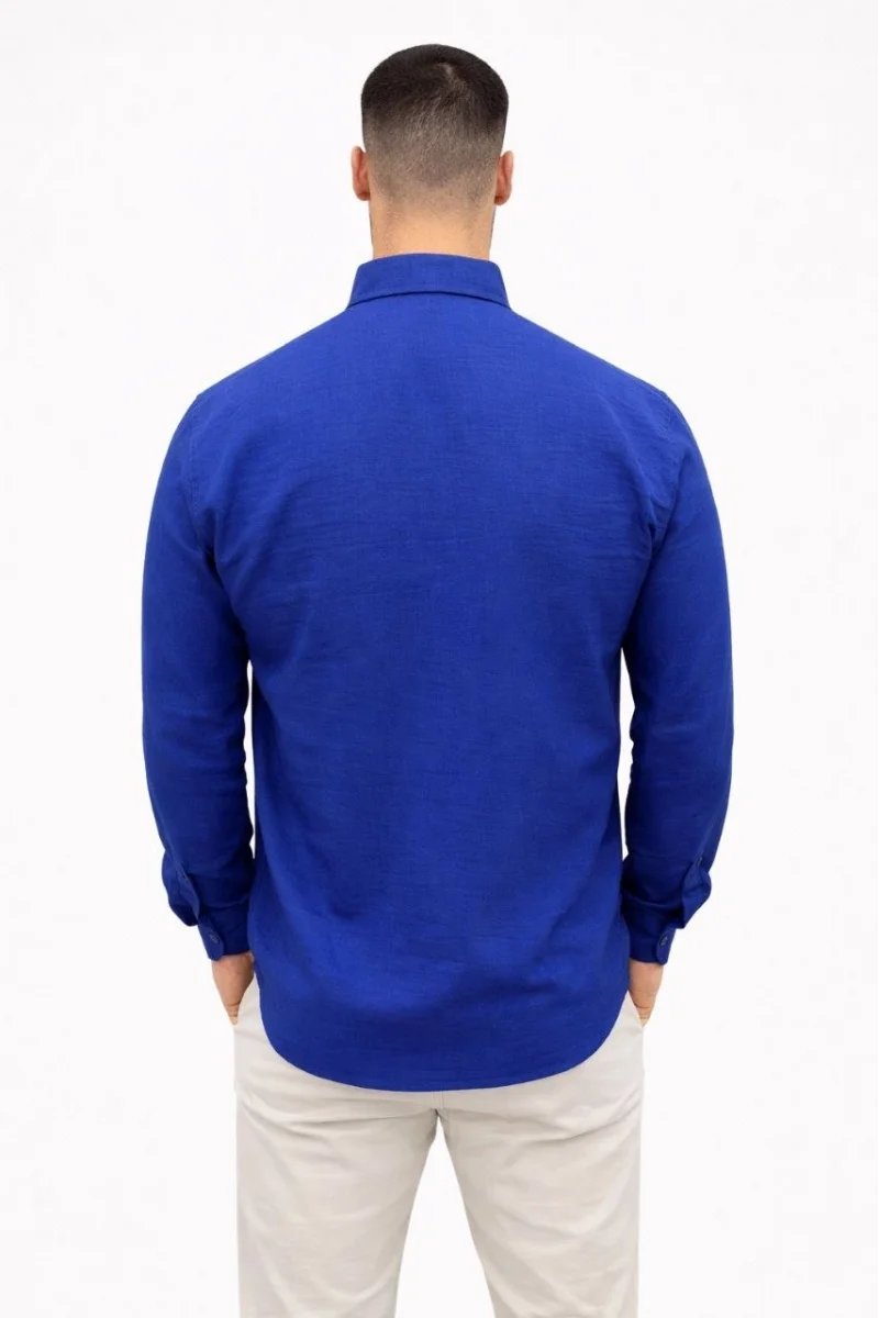 Erkek KETEN Kumaş Oversize Uzun Kollu Rahat Kalıp Gömlek - Saks Mavisi