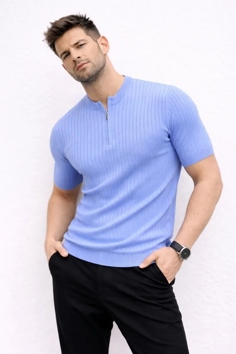 Erkek Kısa Kol Fitilli Triko T-Shirt Yazlık Hakim Yaka Tişört - Bebek Mavisi