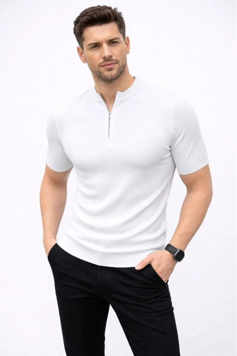 Erkek Kısa Kol Fitilli Triko T-Shirt Yazlık Hakim Yaka Tişört - Beyaz