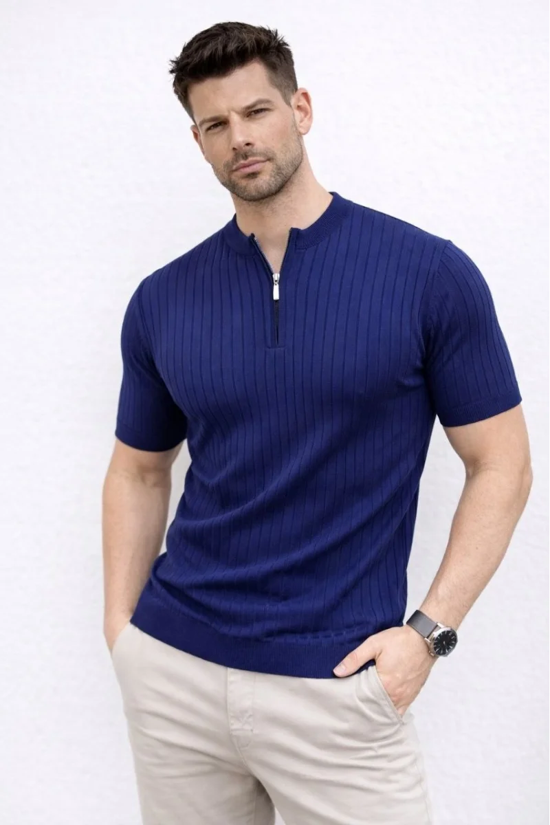 Erkek Kısa Kol Fitilli Triko T-Shirt Yazlık Hakim Yaka Tişört - Lacivert